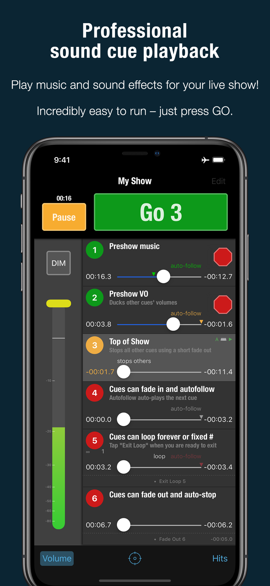 • Adjust volume, pan, tempo & pitch independently for every cue.