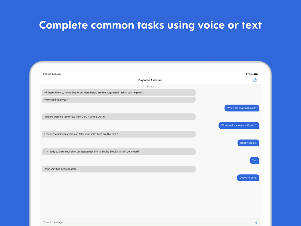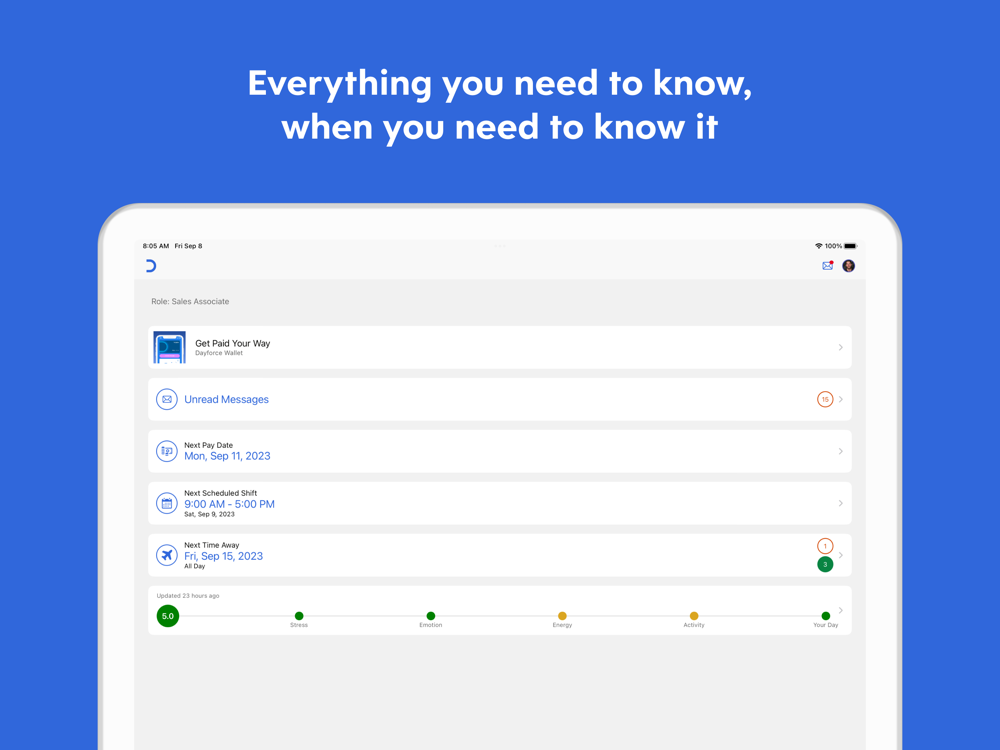 As an employee, being able to access work-related tasks quickly is critical, so you can focus on your job. From checking your schedule, to requesting pay instantly, to setting performance goals, Dayforce lets you manage these tasks from your mobile device.