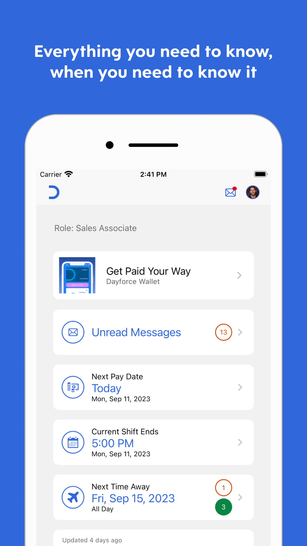Disclaimer: Dayforce mobile features will be limited to the Dayforce web version that has been deployed to your organization.