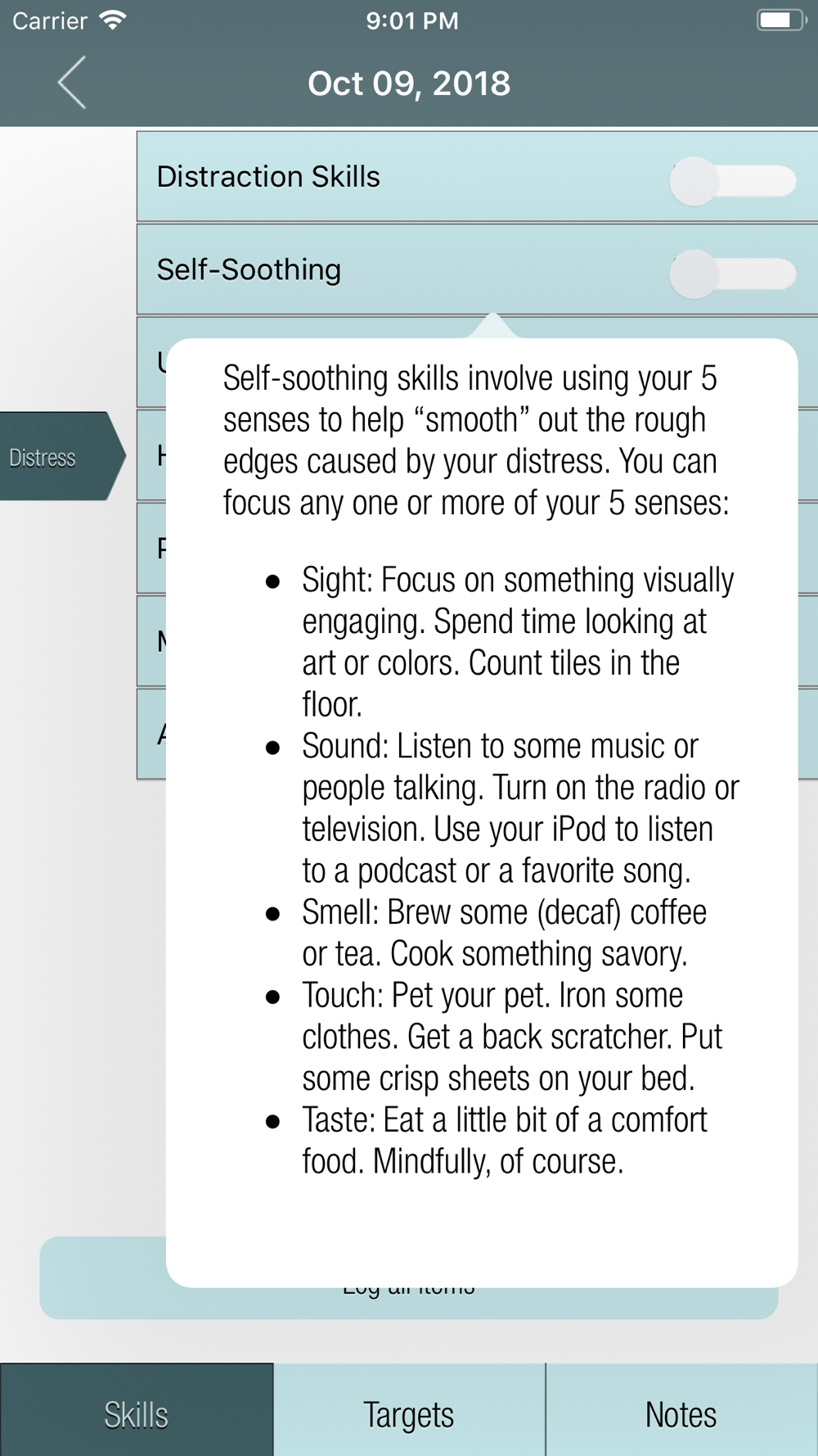 - Skills. LOTS of them. Every DBT skill you've ever heard about in a group is in here. It can be your quick reference to your skills so that you don't have to carry around your book or binder. Every skill is described in readable language to help you understand them easily and it's all just a quick tap away.