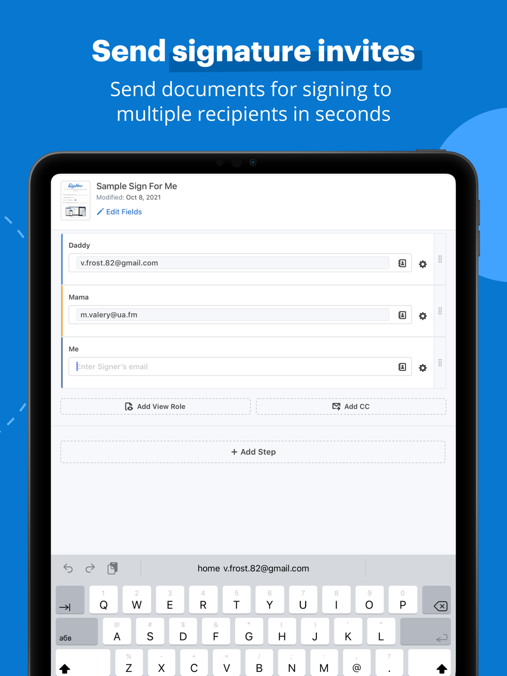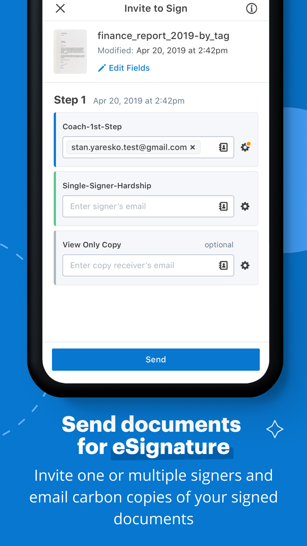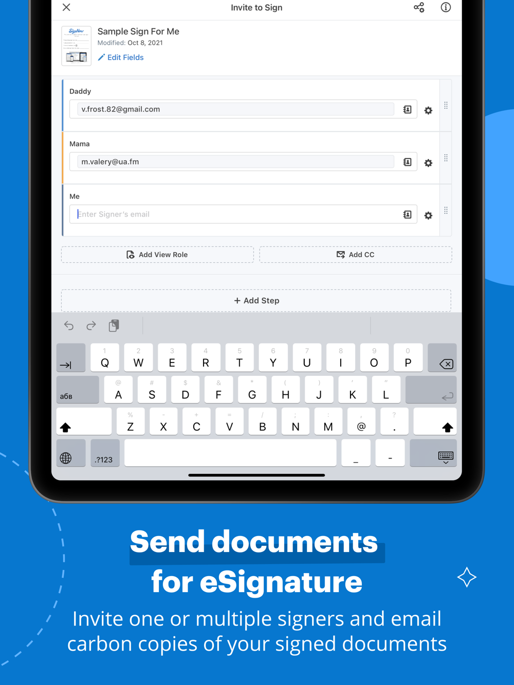 "signNow" is a mobile app for e-signing PDF documents and other formats by one or multiple signers.