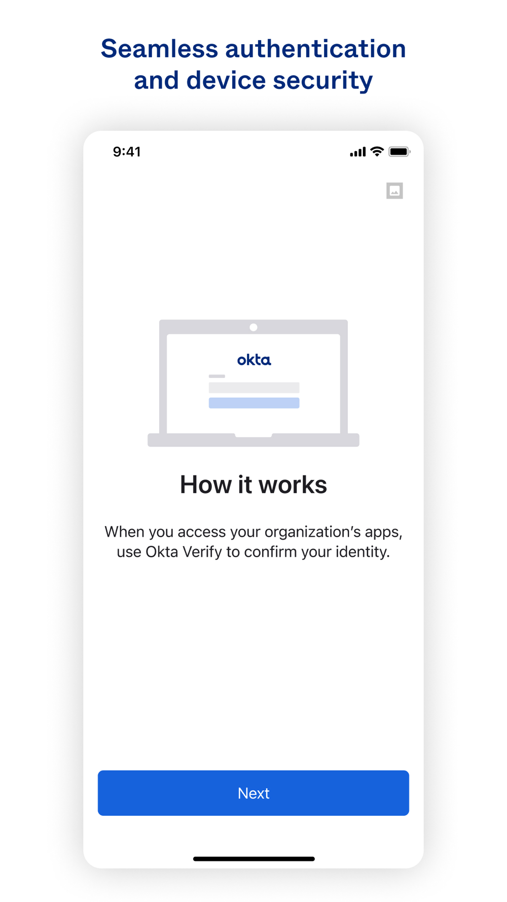 Okta Verify is a lightweight app that is used to register your device to Okta. Registering your device to Okta gives you passwordless authentication to apps, strong device-level security, and more.