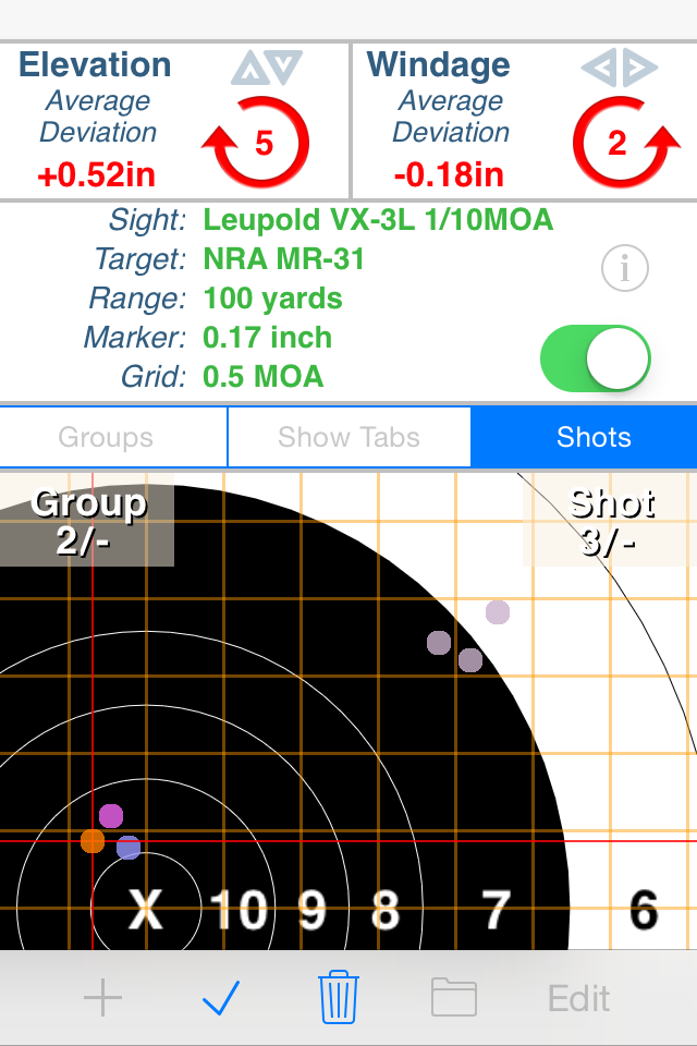 SightSet calculates average distance of your shots from the target center (in cm, inches or MOA), tells you how many clicks you need to make to adjust for windage and elevation, and even reminds you which direction you should turn the adjusters. If a couple of your shots have gone wild, simply go into edit mode to delete them so they don’t affect the calculations. You can even overlay a grid onto the target to get an easy indication of the spread of your shots.