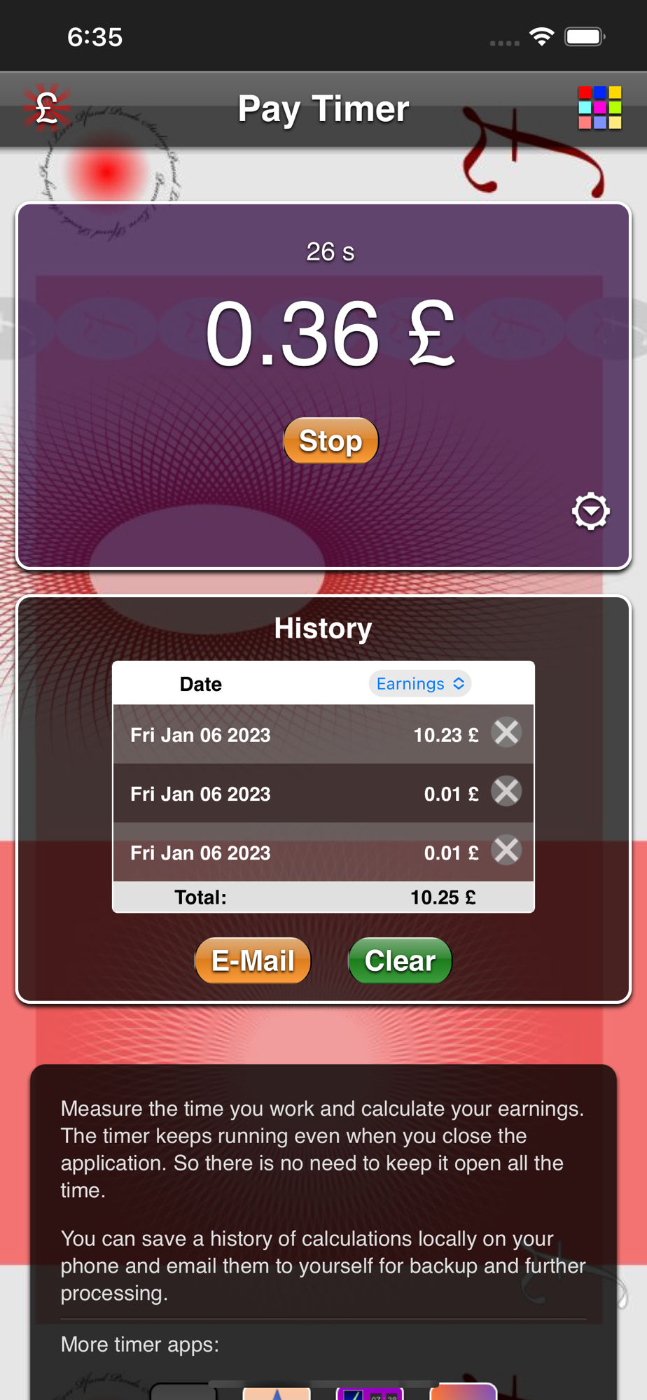 Measure the time you work and calculate your earnings. The timer keeps running even when you close the application. So there is no need to keep it open all the time.