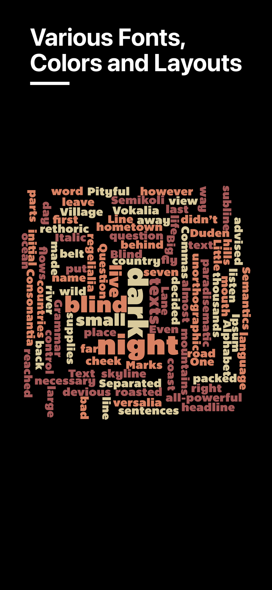 Select color theme, font and layout for making of stunning word clouds that can be used for various purposes. The most common words in the input text are showing bigger size to distinct it among other words. In the result you receive a high-resolution image that can be saved or shared.