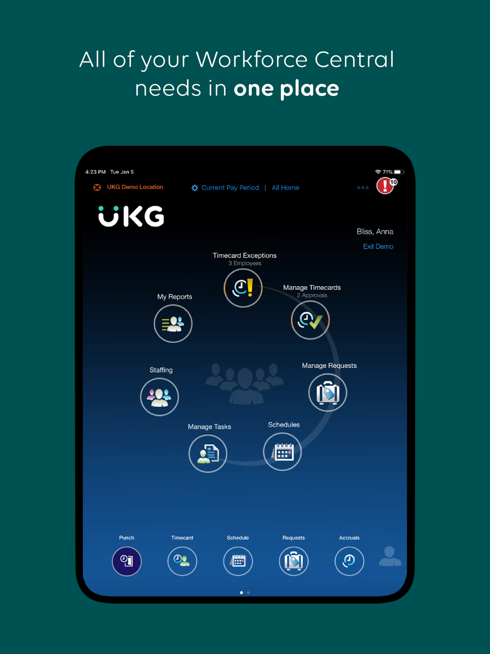 Built to help simplify your work needs, the Workforce Central tablet app (formerly known as Kronos Tablet) provides employees and managers quick, secure access to Workforce Central.