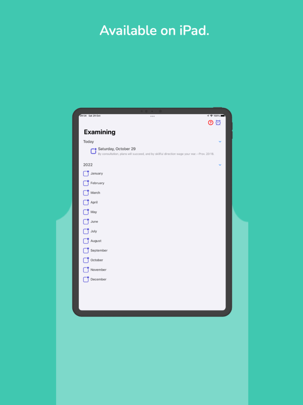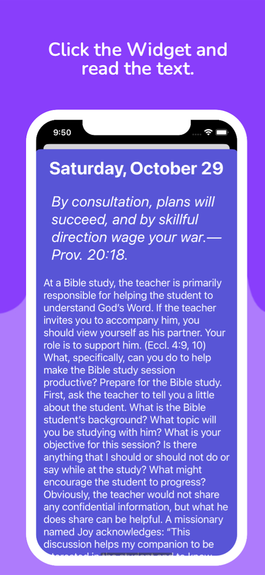 An app to be able to read the text of the day on your main screen through a Widget. You can also read the text on your watch. You can set a notification to alert you every day so you don't forget to read the text. It is also available for iPad.