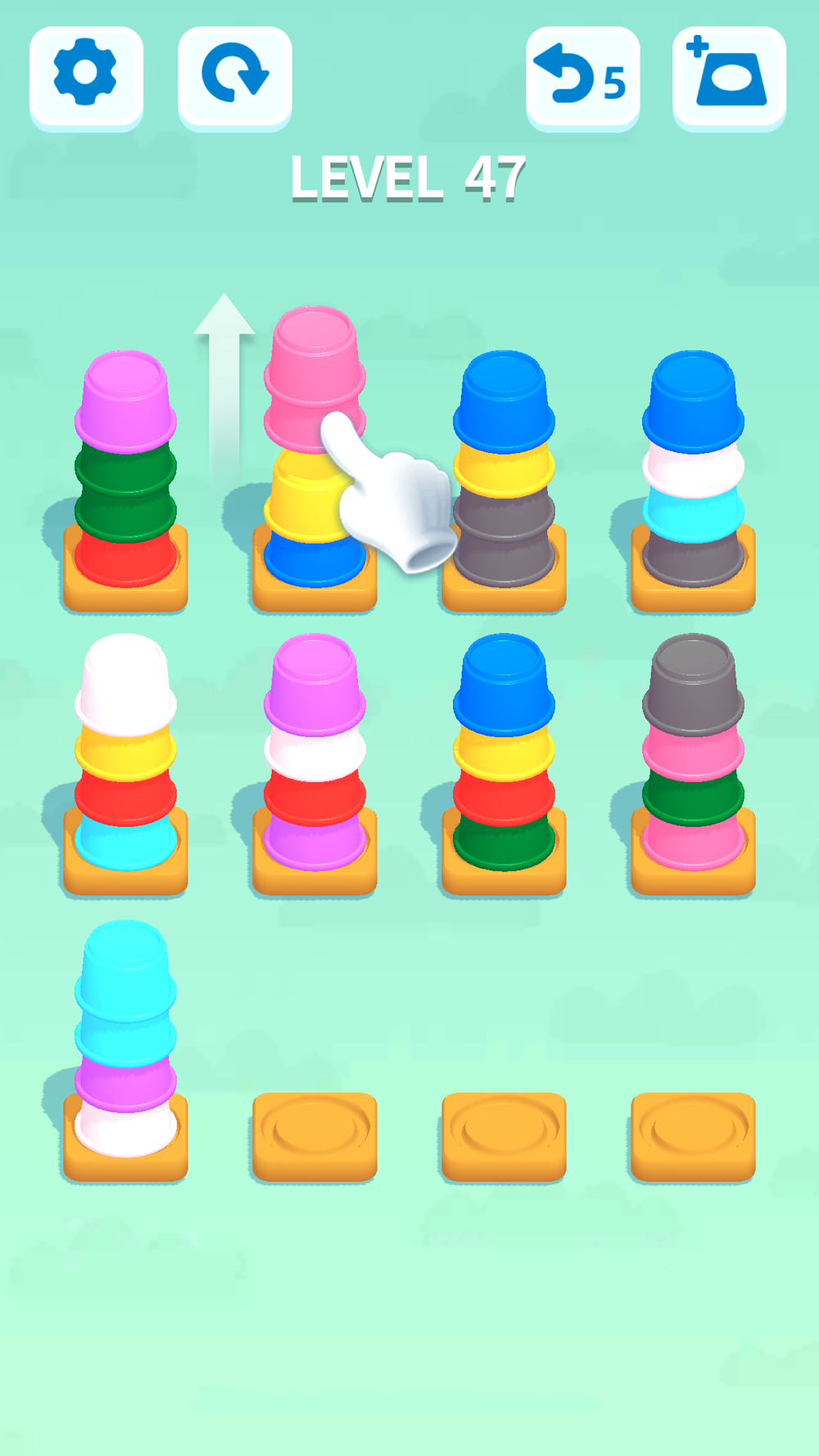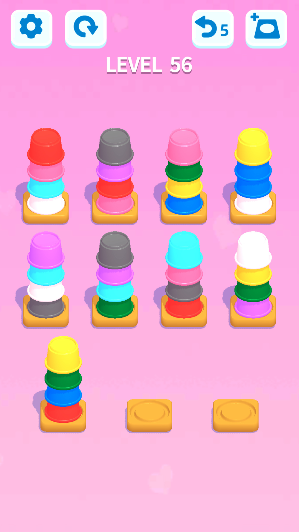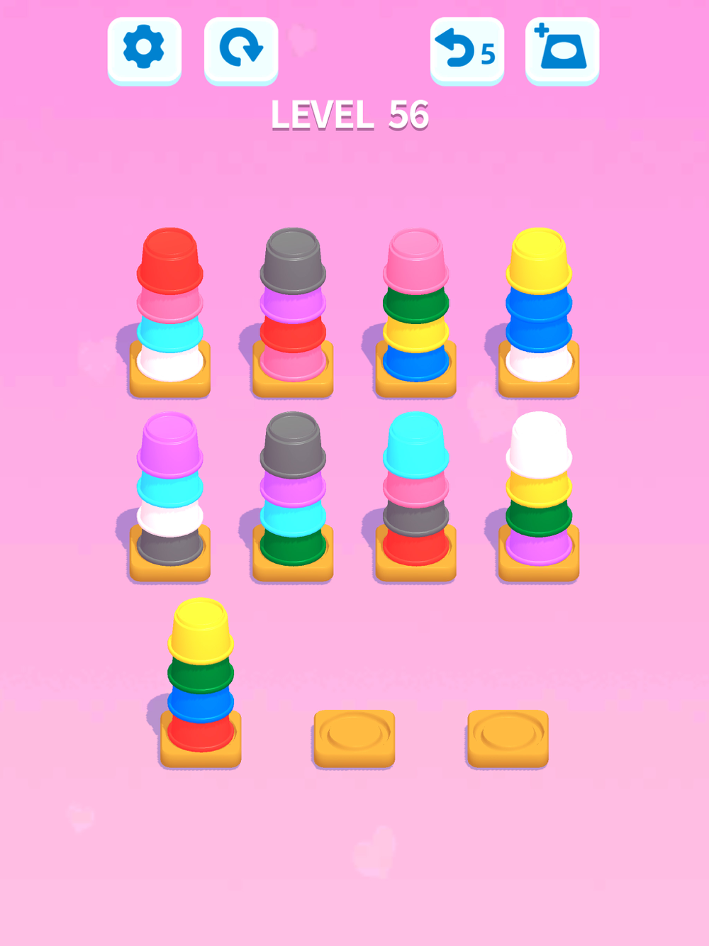 Try to sort the colored buckets until all buckets of the same color are in the same stack.Think,strategize and predict each move.
