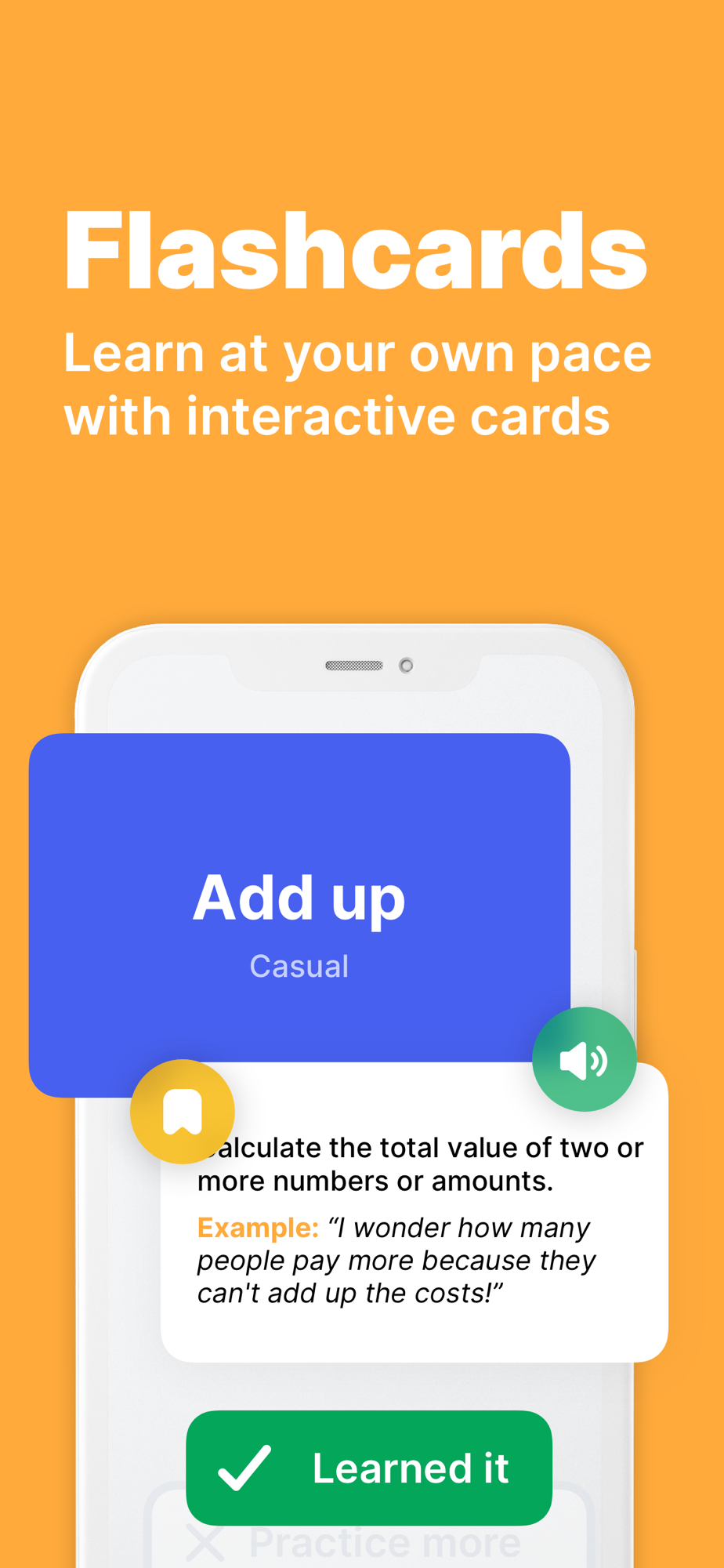 Trying to speak like a native English speaker? Then, this app is for you! Learn 500+ useful English Phrasal Verbs to speak fluently and expand your vocabulary. Find complete definitions and meanings, usage and examples, and pronunciation with interactive flashcards. Helpful for preparation of GRE, IELTS, SAT, SSC CGL, TOEFL, CAT, AFCAT, and etc. exams. VOCABULARY FLASHCARDS Learn from more than 500+ essential English idioms carefully picked by expert tutors. Use the Smart Round for personalized flashcards generated by our learning algorithm. PRONUNCIATIONS! Use the audio-enabled lessons and easily follow each flashcard, word by word, with better concentration. TRACK TEST & STUDY PROGRESS Keep track of your progress through the chapters and lessons. Quickly pick up where you left off with the Continue Studying shortcut. FULL OFFLINE MODE Study on the go! Use the app without an internet connection and still access all the categories, flashcards and tests. OTHER FEATURES: - Customizable Study Reminders - Dark Mode Support (with automatic switch) - Listen To Glossary Words Pronunciations Feedback on the app, the content, or the questions? We always would love to hear back from you! You can reach us at