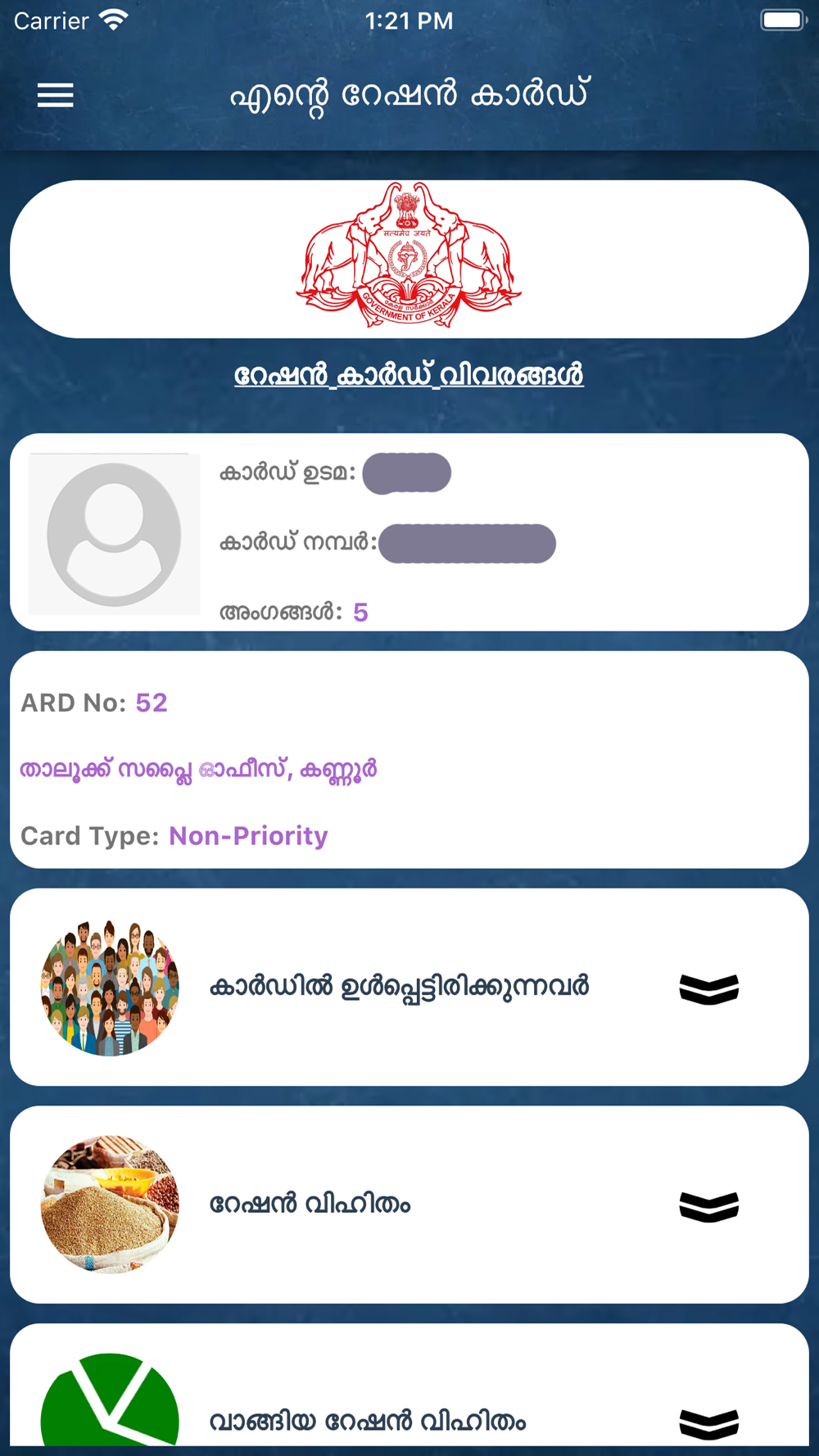 ‘Ente Ration Card’ is an initiative of Civil Supplies and Consumer Affairs Department, Government of Kerala. This app provides details of members in the Ration Card, Ration Card Type, status of online applications submitted, monthly ration entitlement and availed quota of the Ration Card holder.