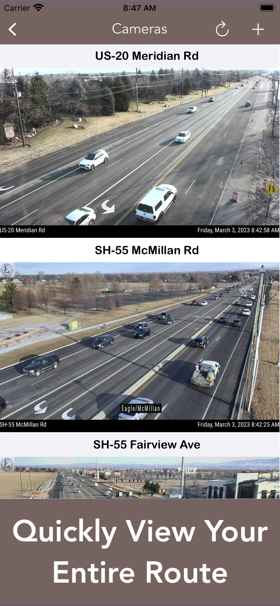 Create custom groups of cameras based on your frequented routes and then simply scroll through the list of images. This makes viewing traffic and road conditions significantly faster. If you prefer to view a single camera at a time, this option is also available.