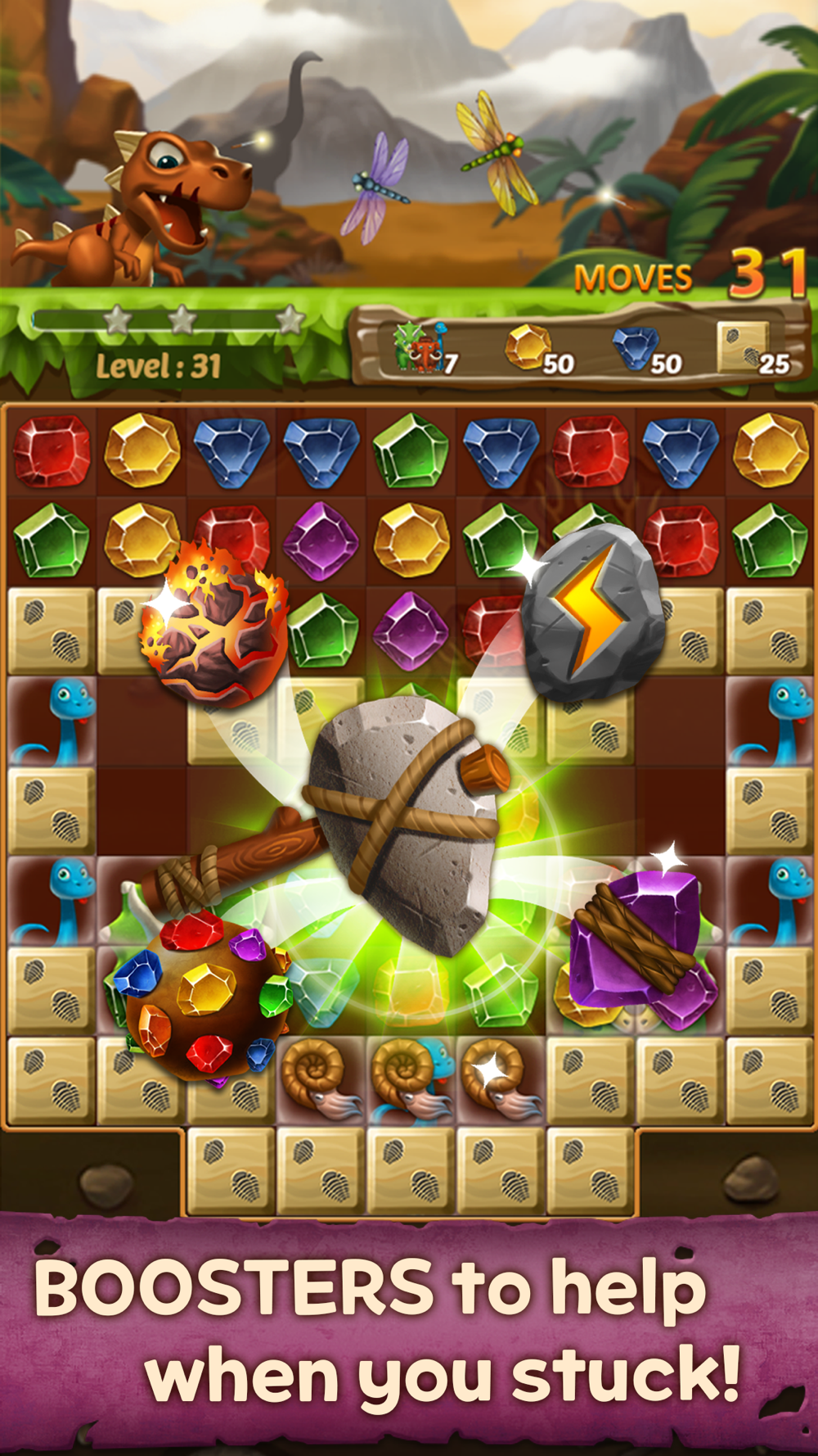 Meet new dinosaur friends and defeat skeleton dinosaurs with powerful boosters!