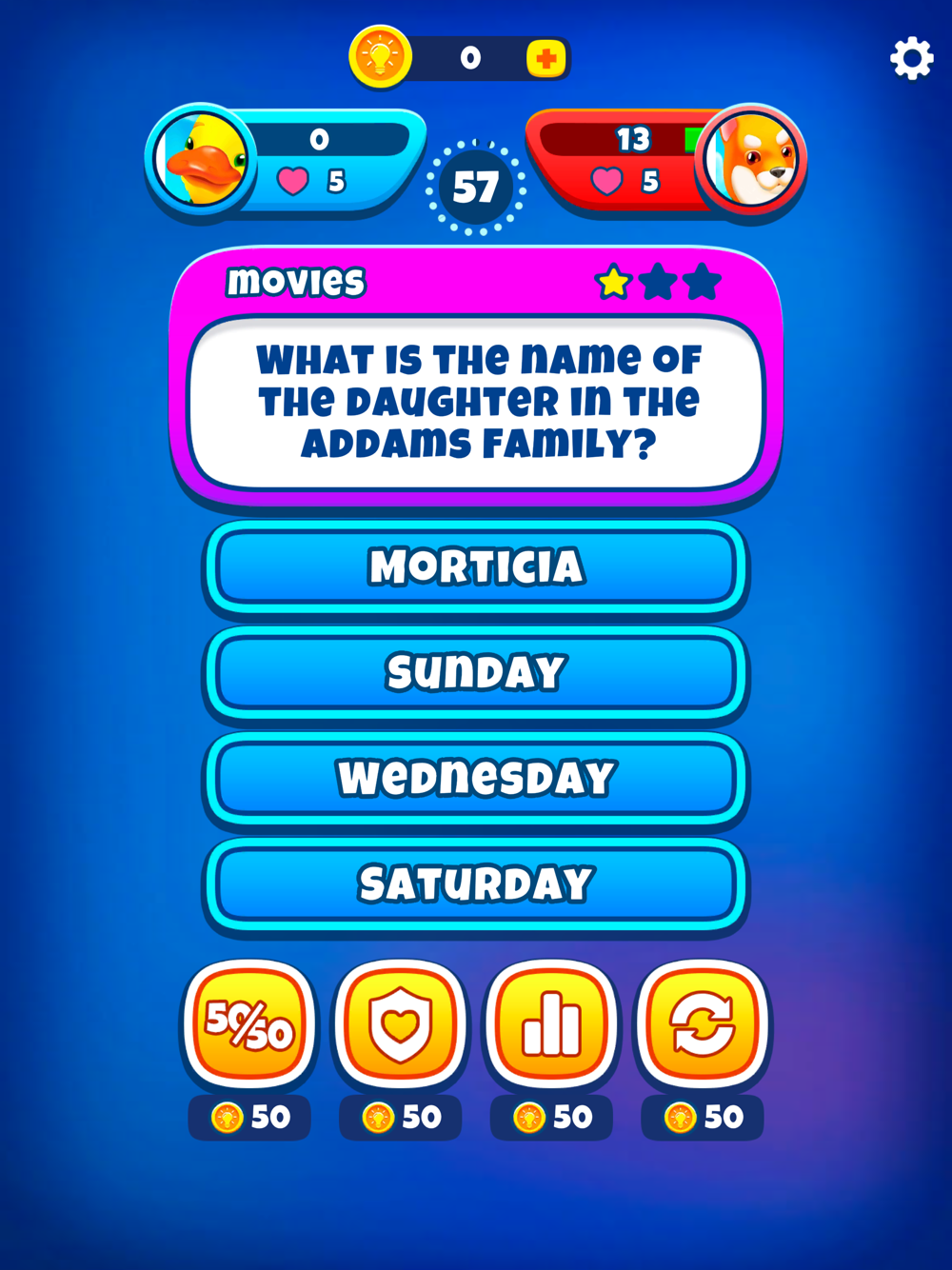 Помимо очков опыта, за серию побед ты также получишь монеты, который сможешь обменять на подсказки и бустеры. За монеты ты можешь убрать половину неправильных ответов, заменить вопрос, посмотреть статистику ответов или даже получить вторую попытку, чтобы ответить на самые сложные вопросы и победить!