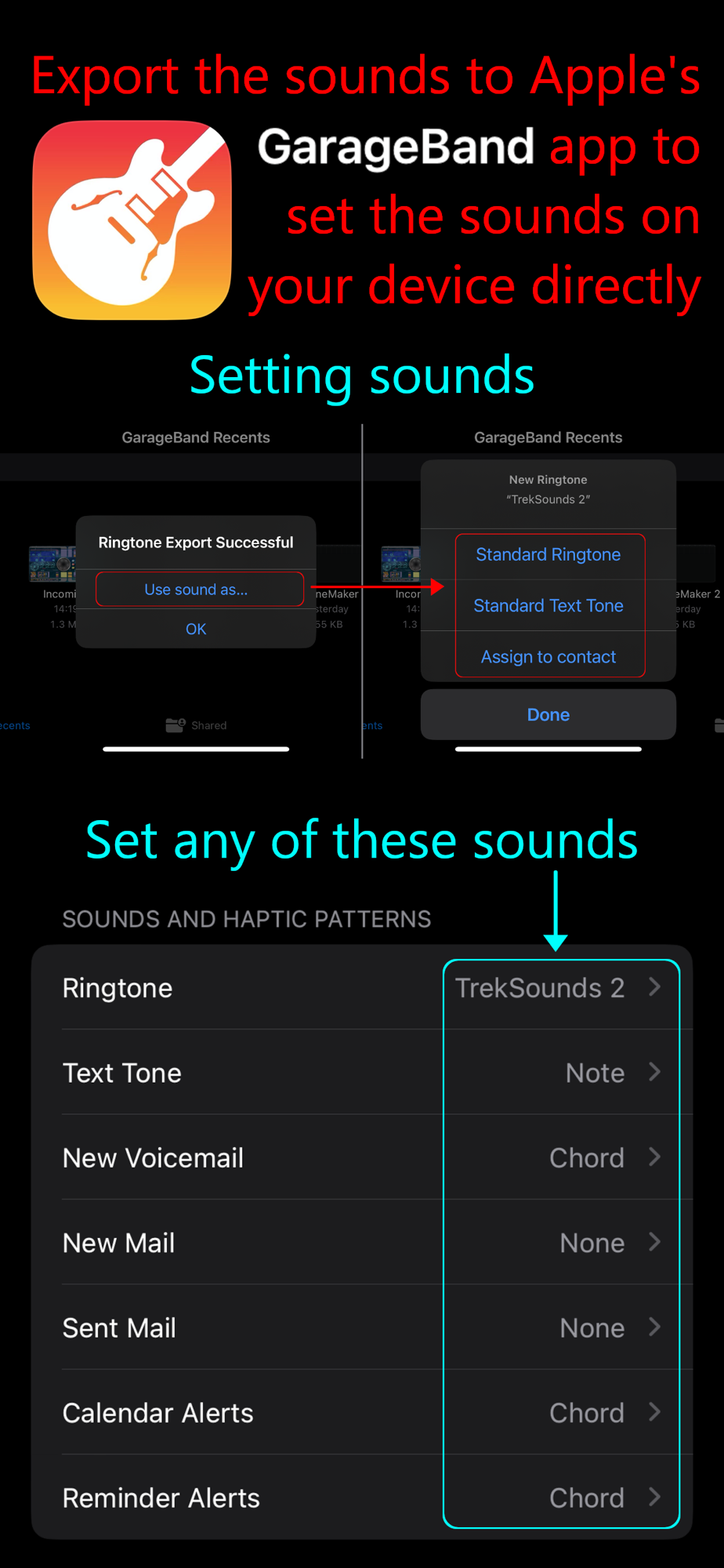 Sounds can be exported as ringtones, notifications, individual contact's notifications, and alarms.