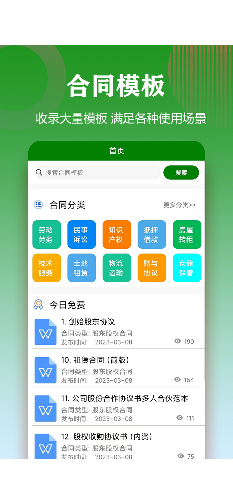 合同模板是一款资源类软件,软件包含了大量的合同模板,包括各种不同类型,不同行业,不同使用场景的模板范文大全供用户使用。能够帮助对合同制定不熟悉的用户,快速完成各种合同的制定,起到很好的参照作用。用户可以直接在线预览或者下载后编辑使用。