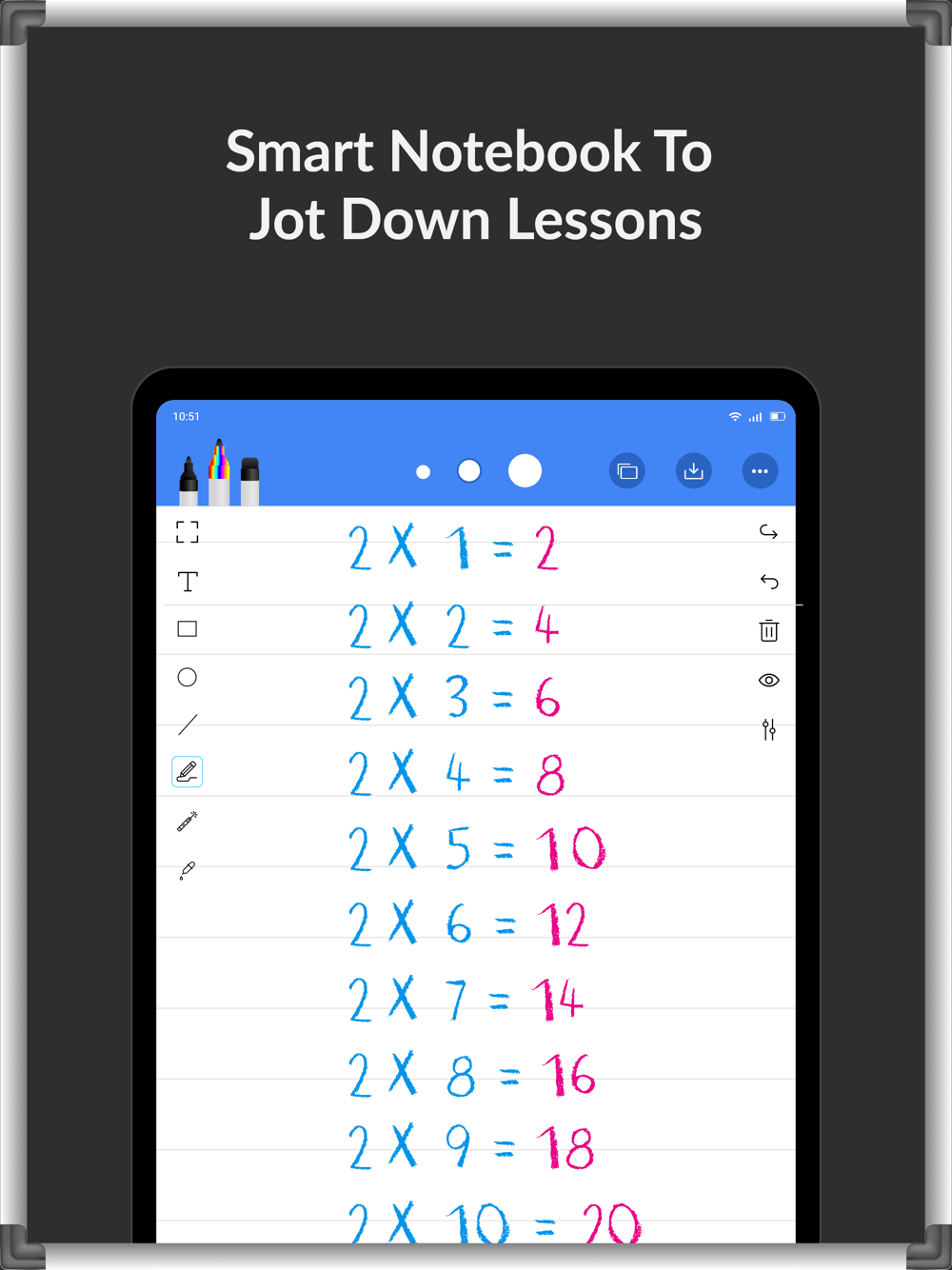 The chalkboard app mimics a traditional whiteboard, but has additional features such as the ability to save, erase, undo and redo actions.