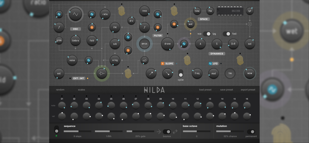 Hilda is a Complex Oscillator Monosynth, inspired by the most interesting aspects of both west-coast and east-coast synthesis techniques. You'll find a wave folder, lowpass gate, and audio-rate modulations, but also a 12-mode filter and traditional VCA circuit. All parts of the instrument are carefully circuit-modelled to sound as analog (or digital, where applicable) as possible. It's like a best-of-all-worlds semi modular synth, but without the patch cables.