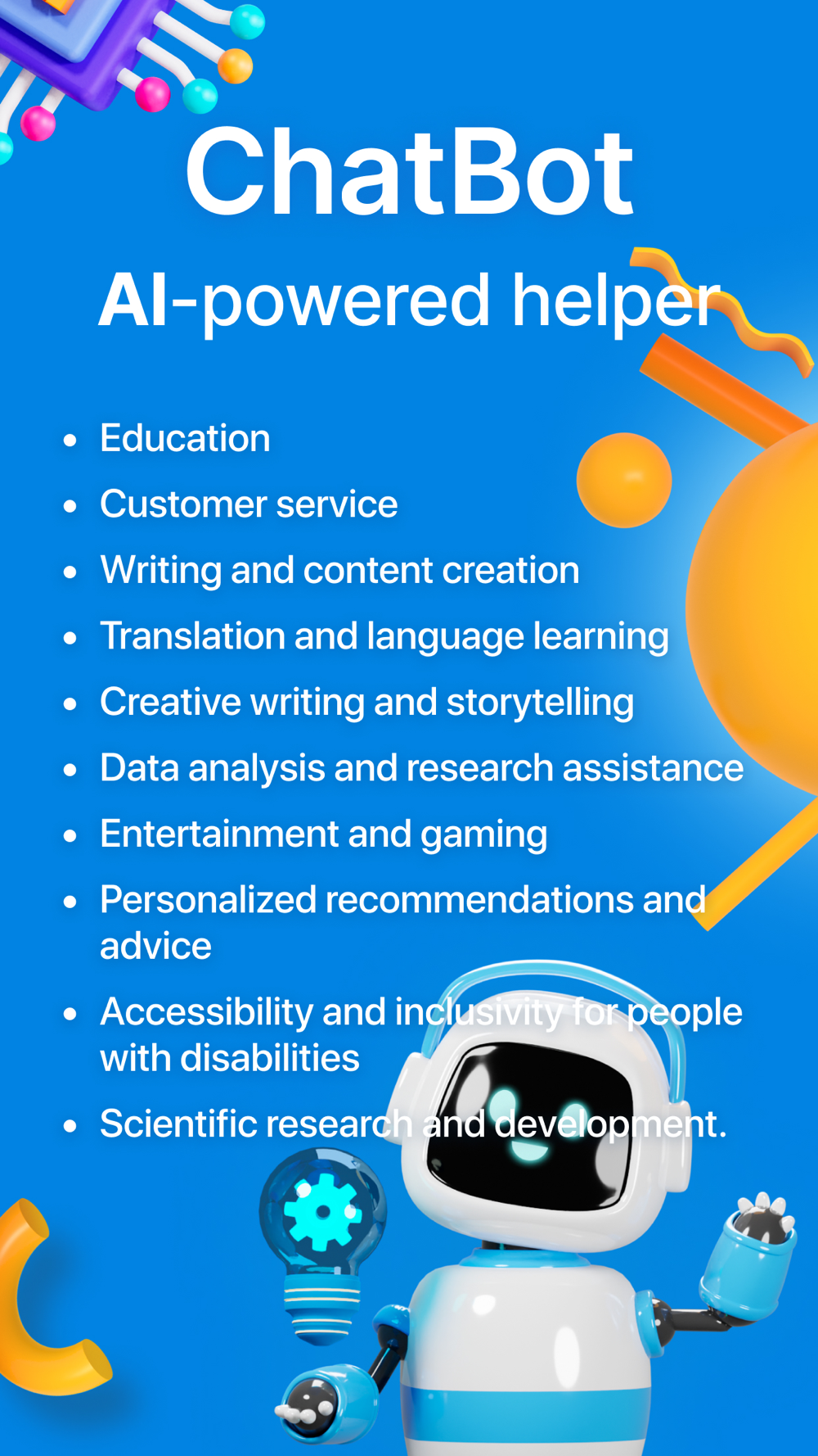 In this application you will find the answer to any question: solve a math problem, write a poem or a song, write an essay, plan a vacation, make a personalized meal plan and solve many other problems.