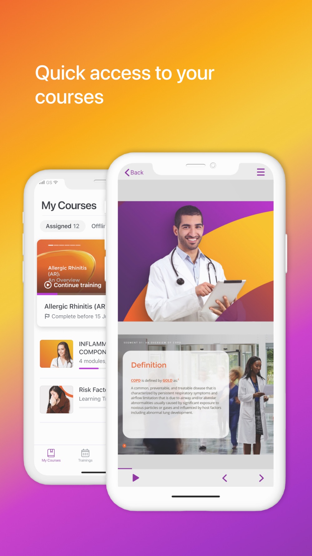 The aim of the available eLearning courses in EducAir App is to provide HCPs whose work involve Asthma, COPD, Allergic Rhinitis, and Antimicrobial Resistance issues, with essential knowledge about safety and efficacy aspects. These professionals can include physicians, pharmacists, and nurses.
