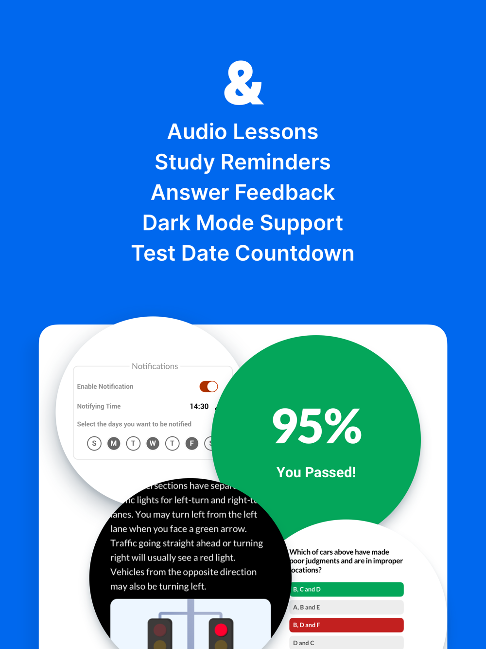 Struggling with the meanings of road signs and symbols? Our app offers an extensive, content-rich flashcard system, designed to familiarize you with every traffic sign and symbol. Begin with a standard flashcard session, then concentrate on signs requiring more practice, as indicated by your previous performance.