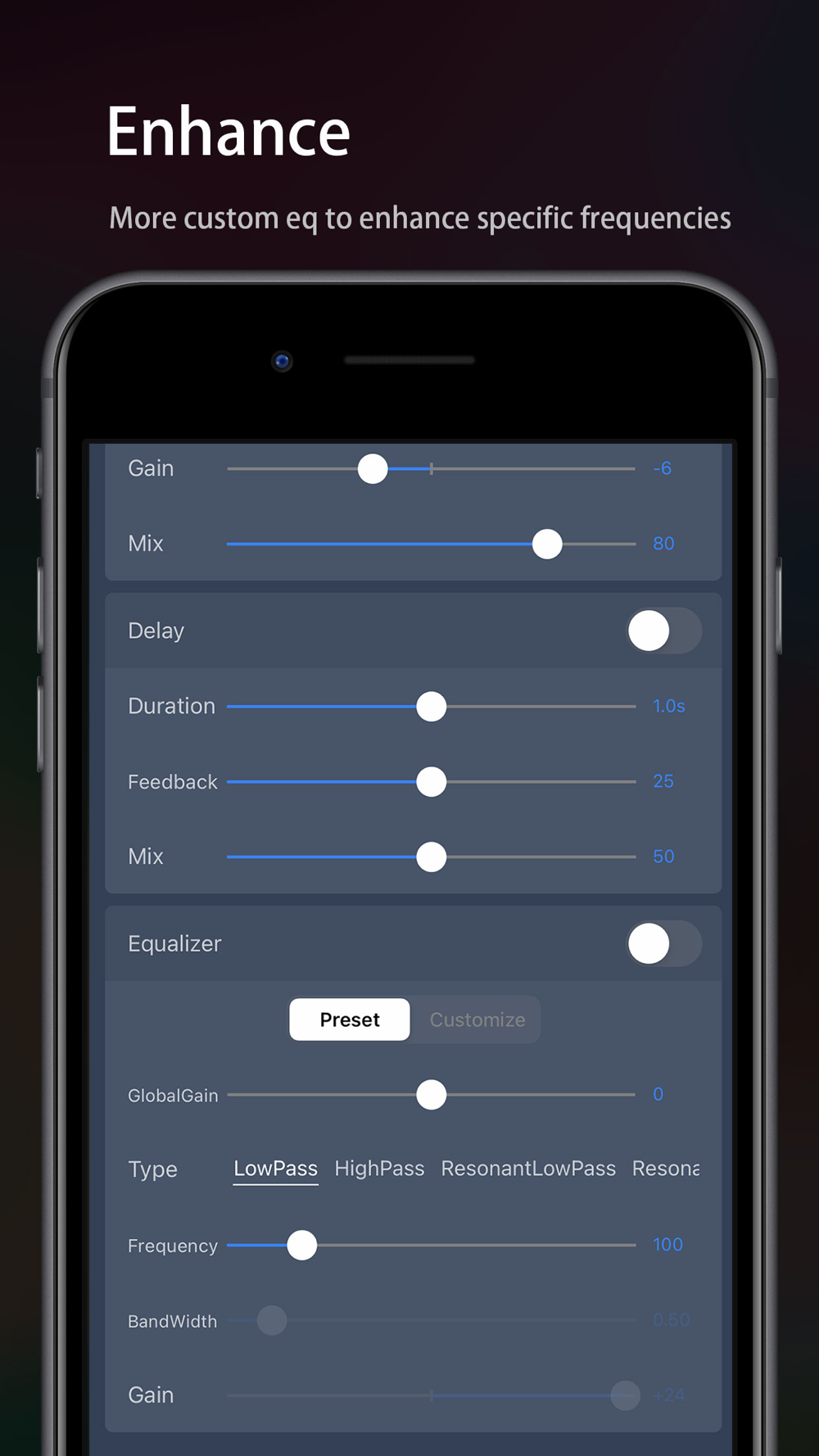 - 「Equalizer」: Bass boost and human voice resonance, etc., custom equalizer with 10 sections of frequency. It makes your audio voice clear, high pitch transparent and low pitch "rhythmic"