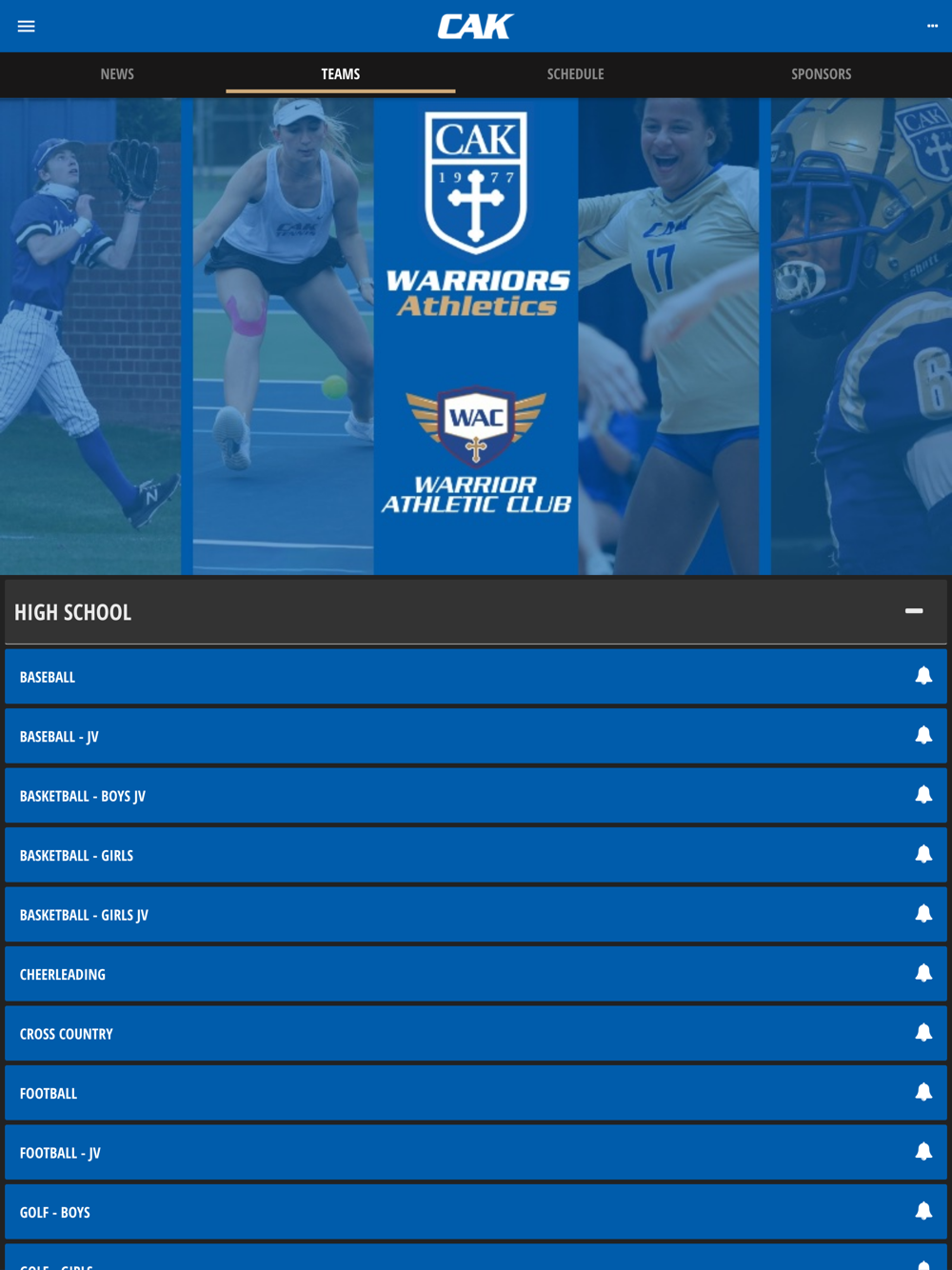 The CAK Athletics app is provided and operated by the Christian Academy of Knoxville and features LIVE scoring, schedules, news updates, and rosters for all participating CAK Warriors teams and organizations.