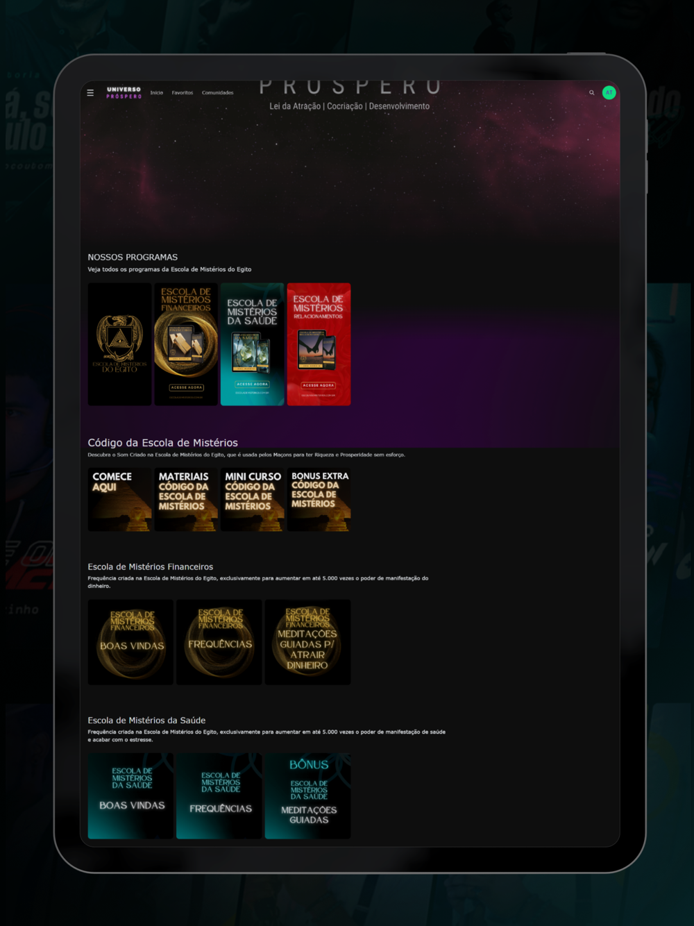 relacionados a lei da atração, cocriação da realidade, desenvolvimento mental e espiritual, além de ferramentas para elevar a sua frequência vibracional. Você poderá visualizar todas as aulas e conteúdos dos treinamentos que você adquiriu.