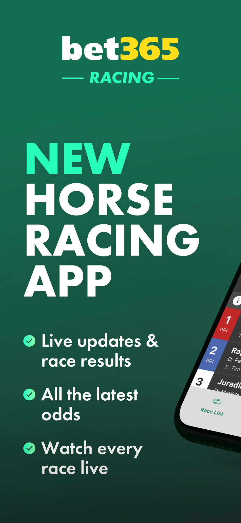 Welcome to bet365 Racing: Bet on and Watch every race from all major tracks with our dedicated Horse Racing and betting app. Enjoy personalized handicapping tools, race replays, and access to hundreds of data points that help build your betslip.