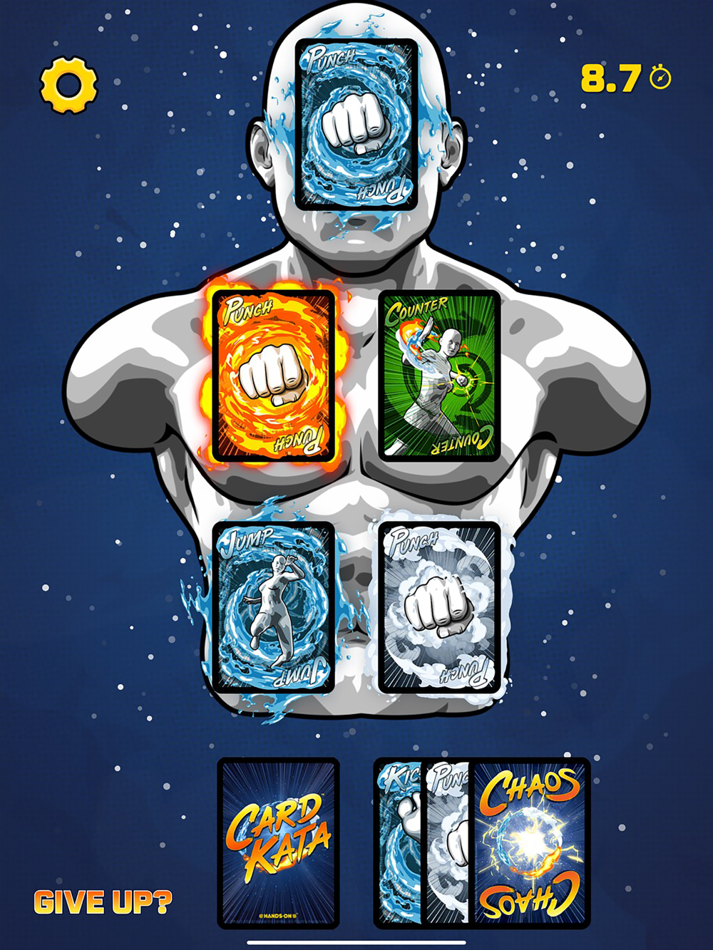 CARD KATA: PRACTICE DUMMY is a solitaire-like single player game where you match elemental attacks to play zones in the shape of a martial arts practice dummy. Defensive cards will attempt to block your zones! Unlock them with a CHAOS card and play out all of the cards in your hand for a perfect CARD KATA workout! Three levels of difficulty: