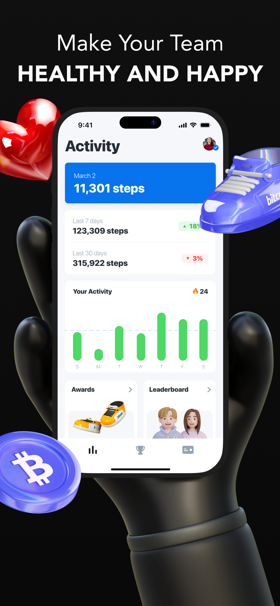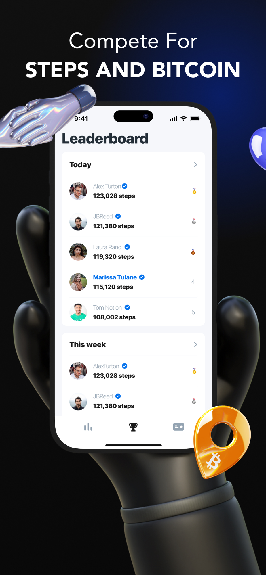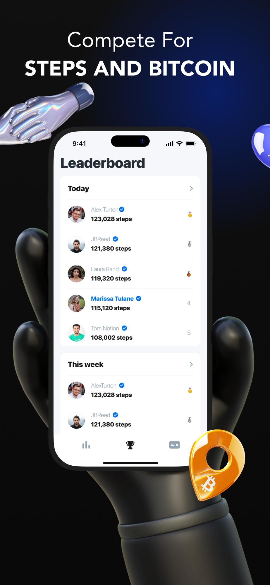 - Walk to Earn: Every step you and your teammates take converts into Bitcoin rewards. Sync with your iPhone’s HealthKit data to track steps seamlessly.