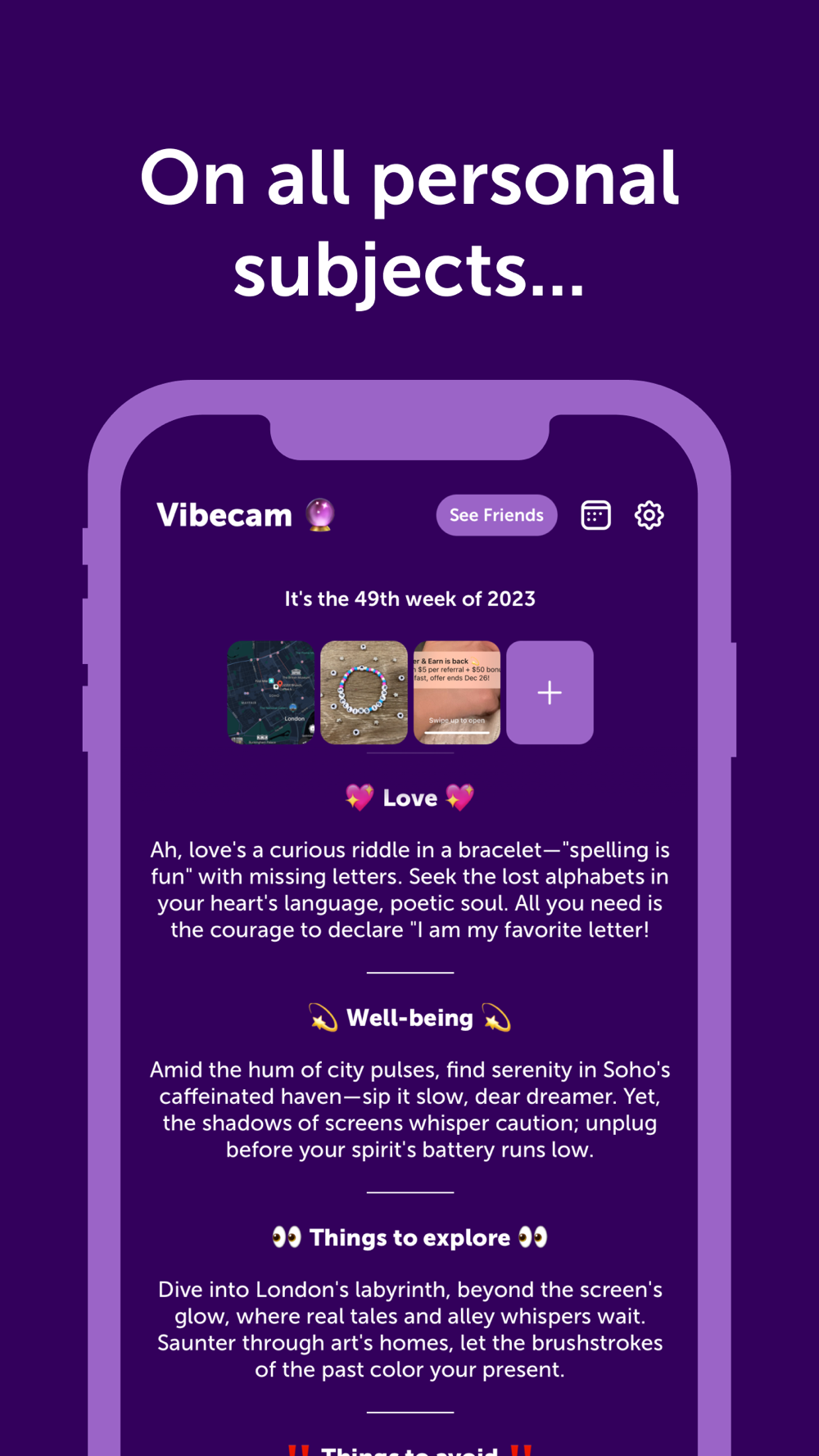 Discover your aura and see how it changes from week to week with Vibecam. Not based on the stars or the mystics, but based on your PHOTOS and how you see the WORLD. Simply upload your pictures from this week or take a selfie, and we'll use some magic to read your vibes, along with some predictions on your love life, well-being, and things to pay special attention to...