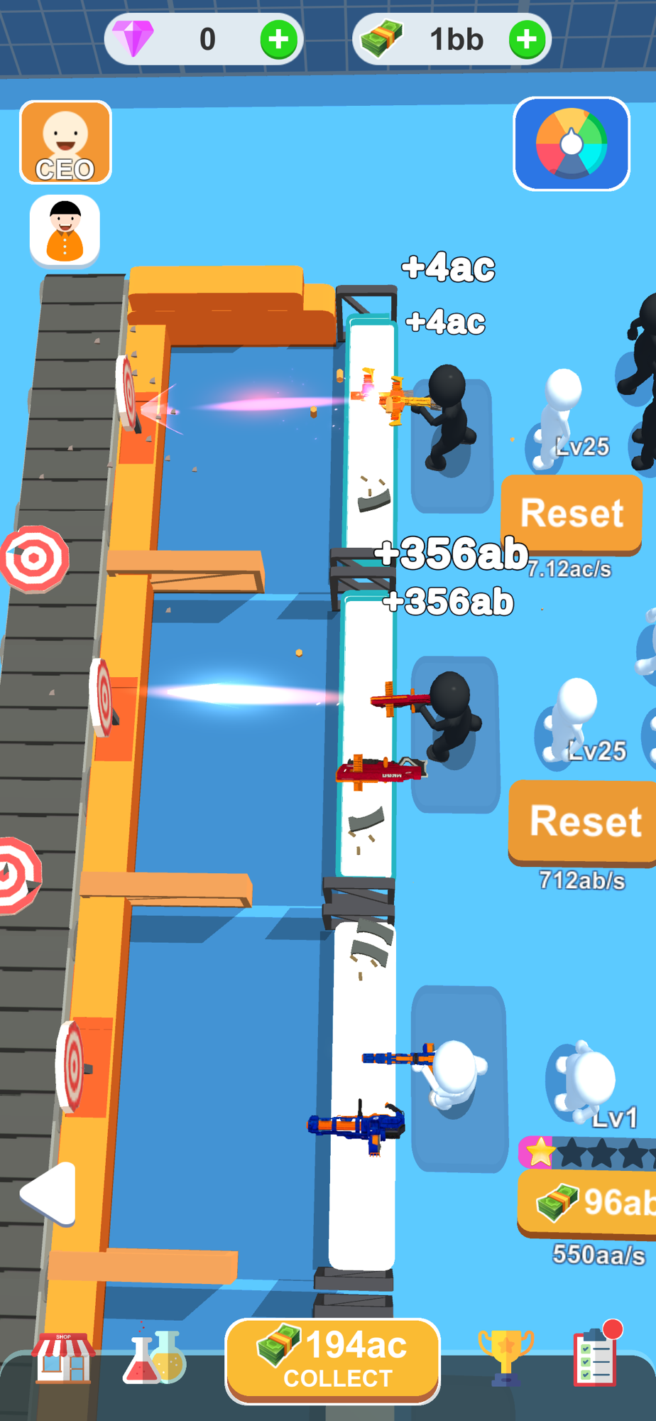 Start with the first shooting target. Attract guests to experience shooting. You can get benefits from it. Upgrade the shooting target with income to give guests a better experience. Then you can buy some new targets to expand your shop. Continuous expansion until you become a shooting field tycoon.