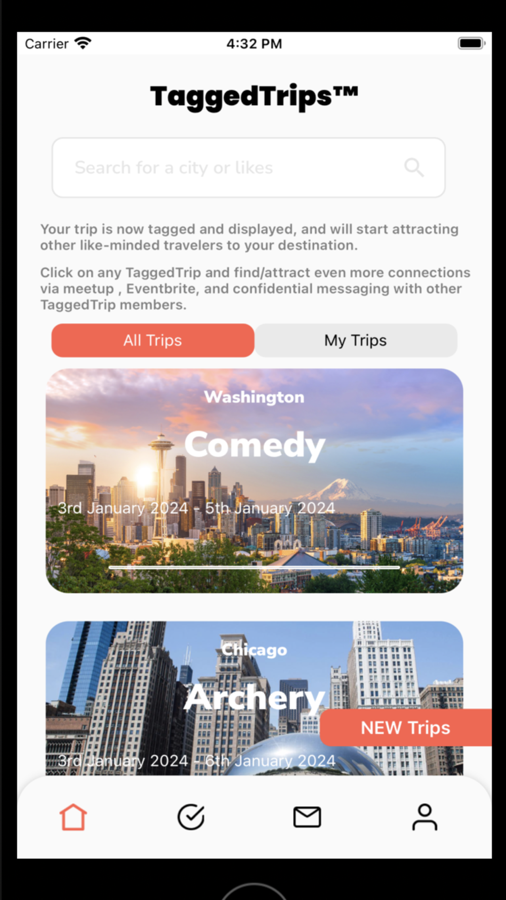 The Simplest and Safest way to meet like-minded people when traveling. Once you sign-up on your mobile APP, any planned future trips become Tagged Trips automatically "attracting" other like-minded travelers to meet up with you at your destination and connect you with groups/events that match your profile.