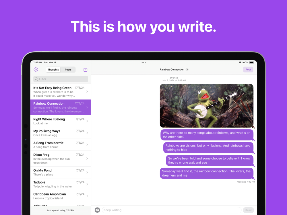 Write your blog posts one message at a time. The app will then combine your messages into a single blog post.