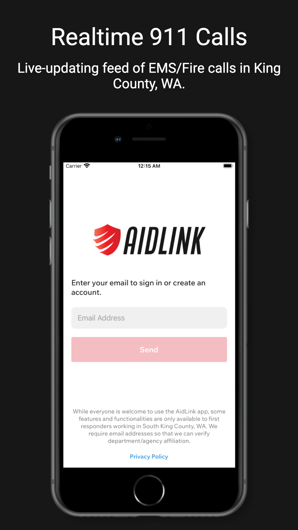 By downloading and using the AidLink app, you understand and acknowledge that the app is not affiliated with any 911 agencies and is not intended to be a replacement for any 911 services. Use of AidLink is intended for supplemental information purposes only and should not be relied upon for emergency situations or as an official source of emergency response coordination.