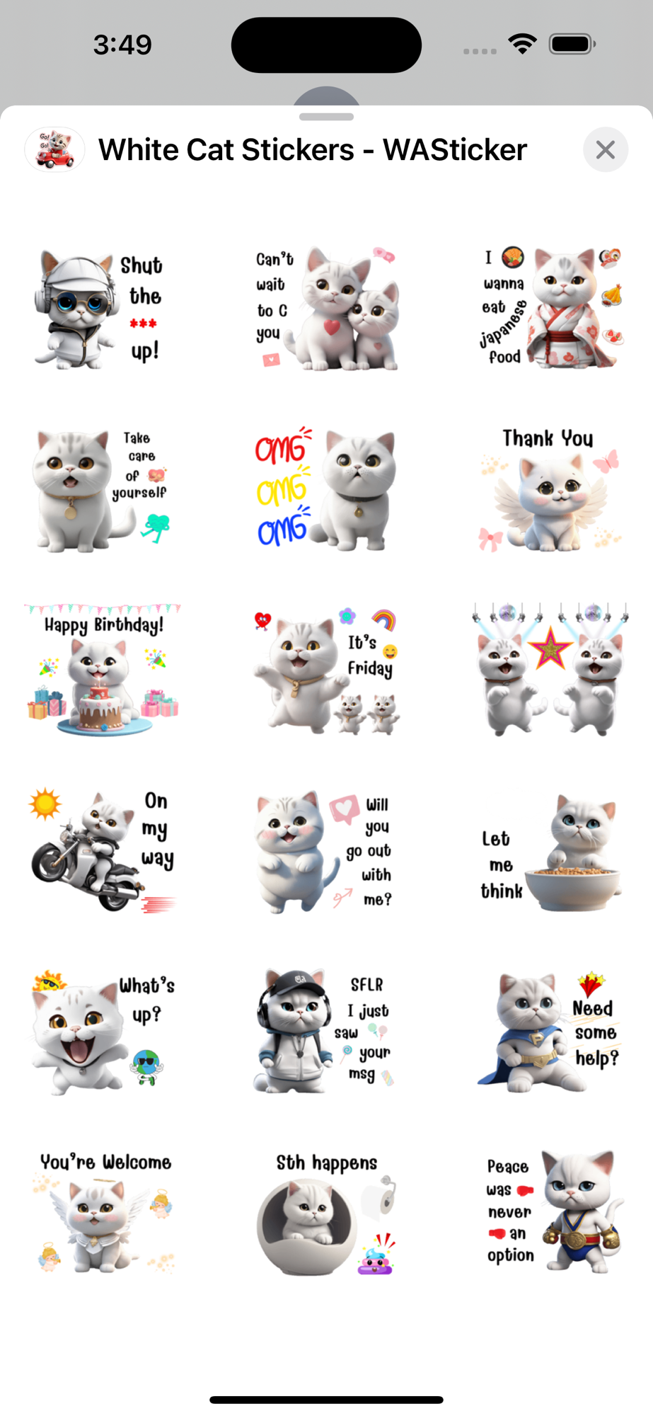 White Cat Stickers - WASticker app is a delightful collection of charming and adorable cat-themed stickers designed for messages. Express yourself in conversations with these cute and whimsical white cat illustrations that range from playful antics to heartwarming poses. Whether you're a cat lover or simply want to add a touch of feline charm to your messages, this sticker pack offers a purr-fect way to bring joy and humor to your chats. Spice up your communication and share the love for these lovely white cats with friends and family through this fun and expressive sticker collection on chats!
