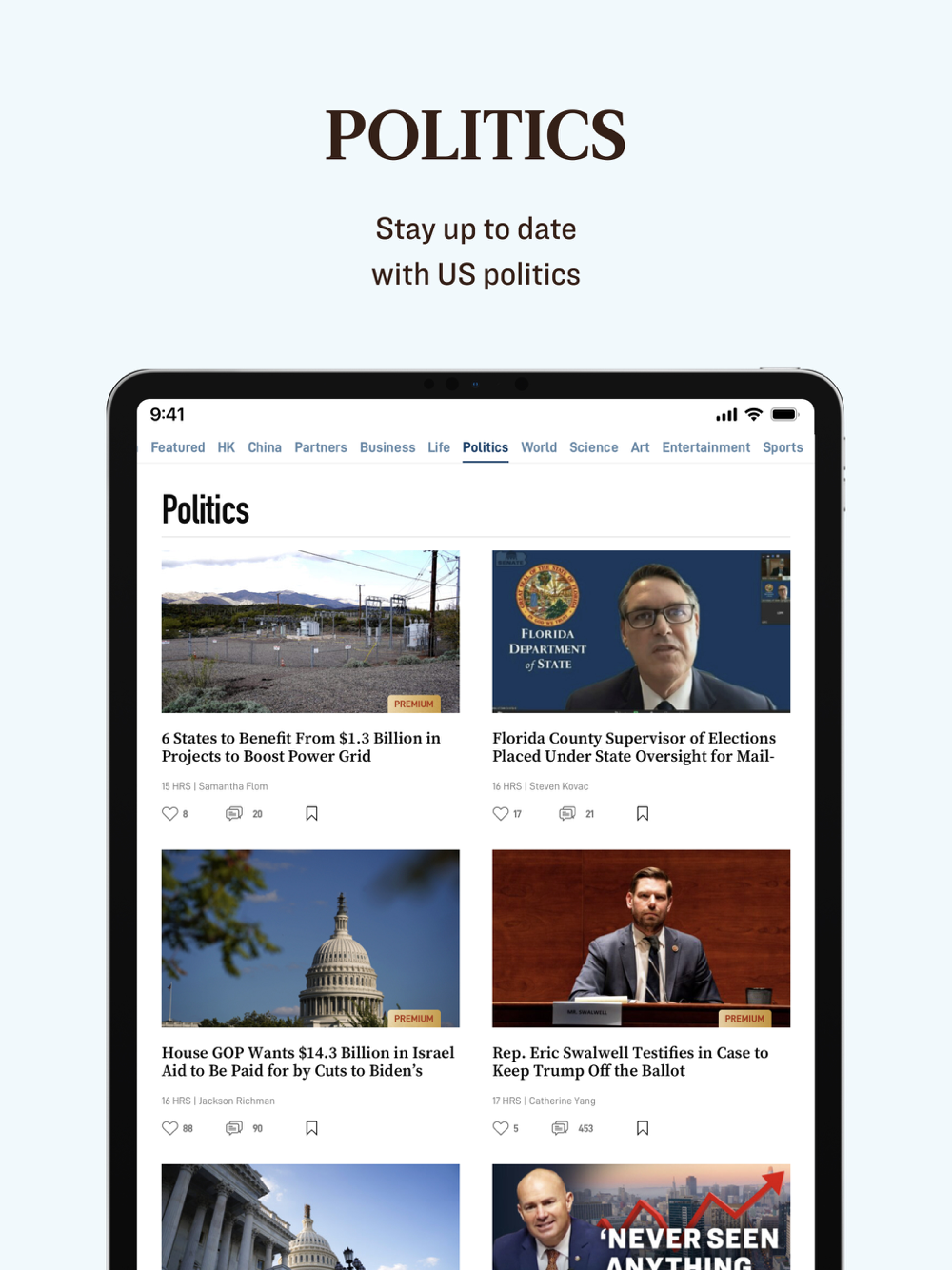 With The Epoch Times app you will have access to all of our digital content, including in-depth coverage of US politics, reporting on China. You will also get access to our premium shows such as American Thoughts Leaders, Crossroads, China in Focus, Facts Matter, The Larry Elder Show, Health Care, as well as commentaries and documentaries on issues that matter. There is special coverage updated regularly on trending topics.