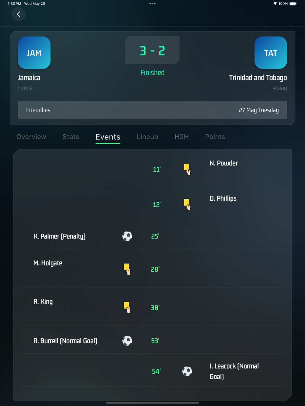 Track every key match moment: goals (normal and penalties), player substitutions, yellow/red cards, and more — all timestamped and structured.