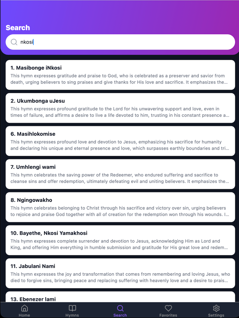 - Complete Hymn Library: Access all 262 hymns from Icilongo LeVangeli, beautifully formatted and numbered.