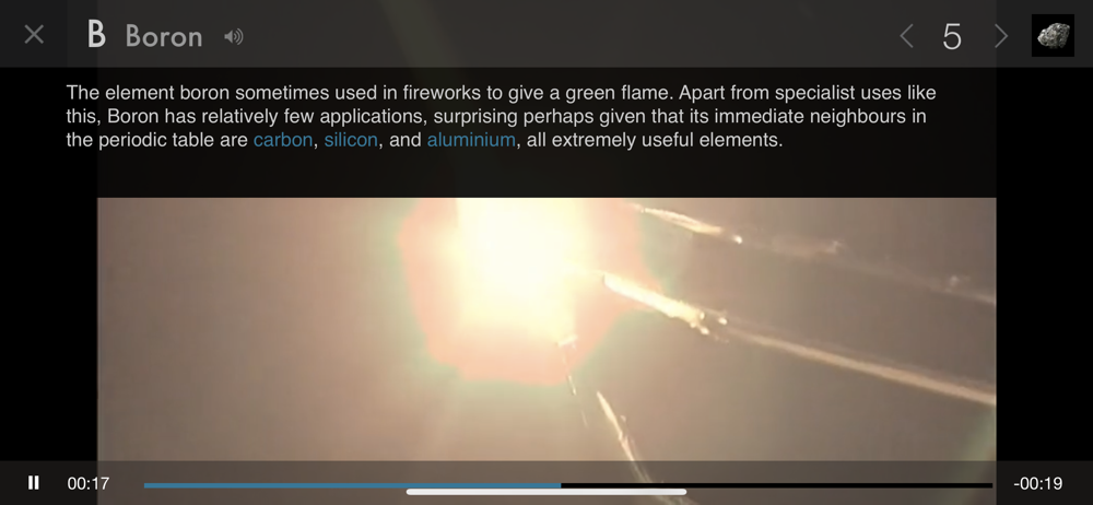 The Elements in Action works as a stand-alone app, but really shines when combined with the original app, The Elements by Theodore Gray. Installed together, the two apps find each other and link together, allowing you to flip seamlessly between viewing the elements as objects of contemplation in the original, and objects of dynamic action in the second.