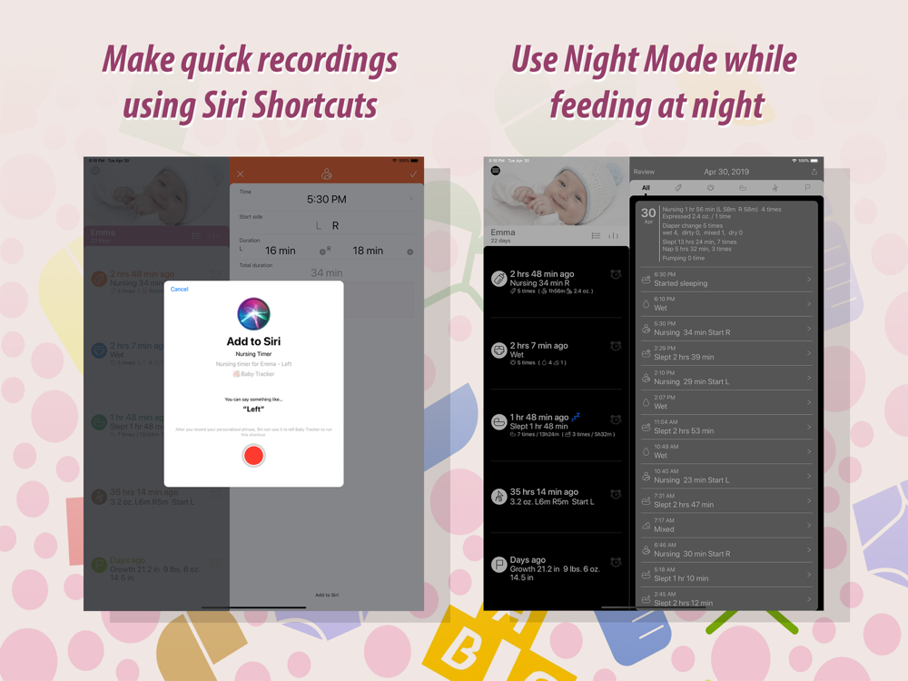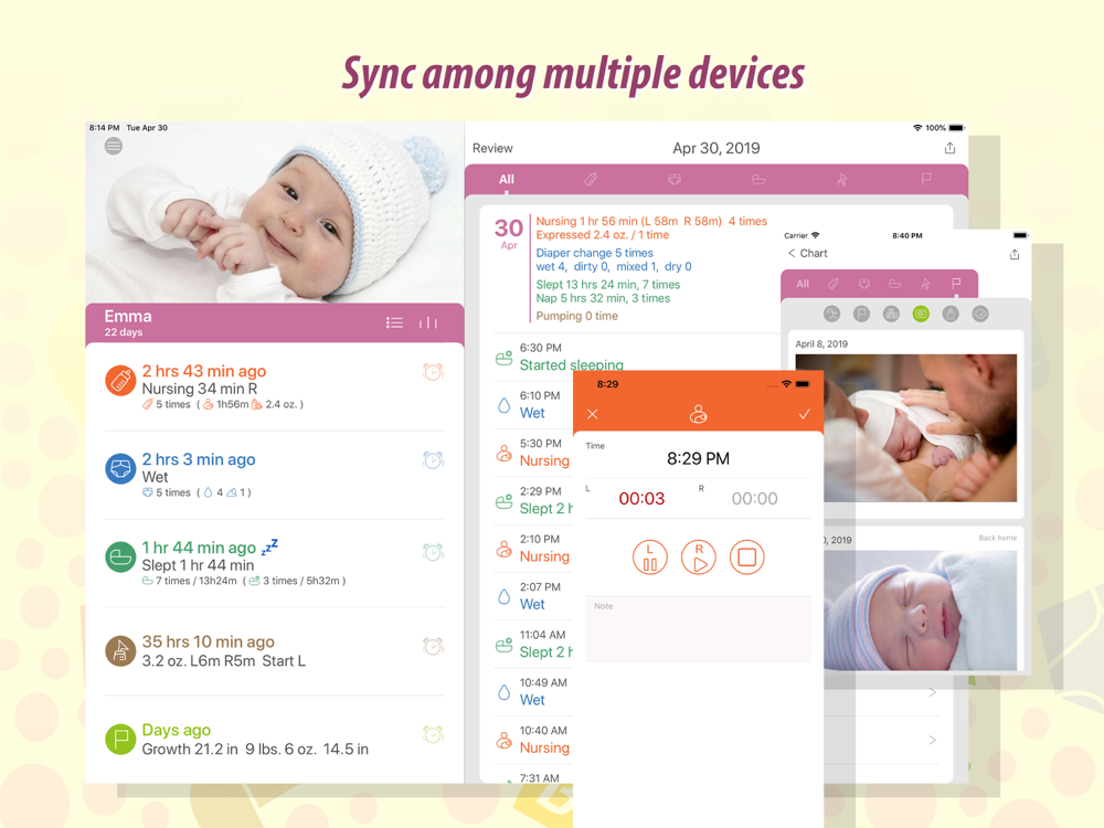 * Sync data among multiple devices for all caregivers or easy sharing of your baby’s progress with others