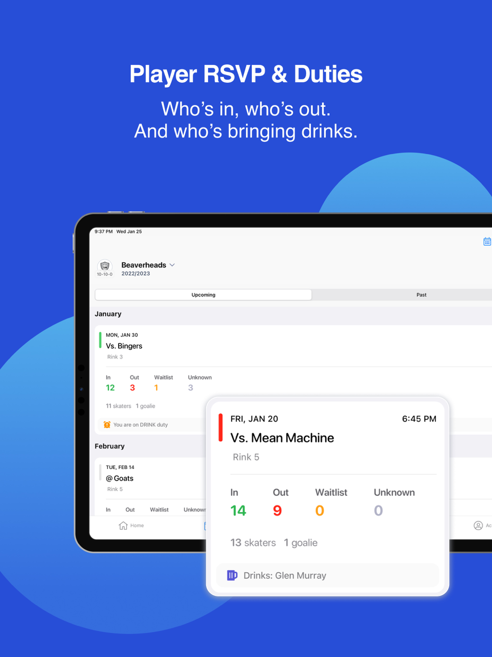 BenchApp makes running your sports team a breeze. Allow players to check in or out from the app, via e-mail, from push notifications, or through text messages. Keep track of stats, games played, drinks and even player payments. Take the headache out of managing your team.