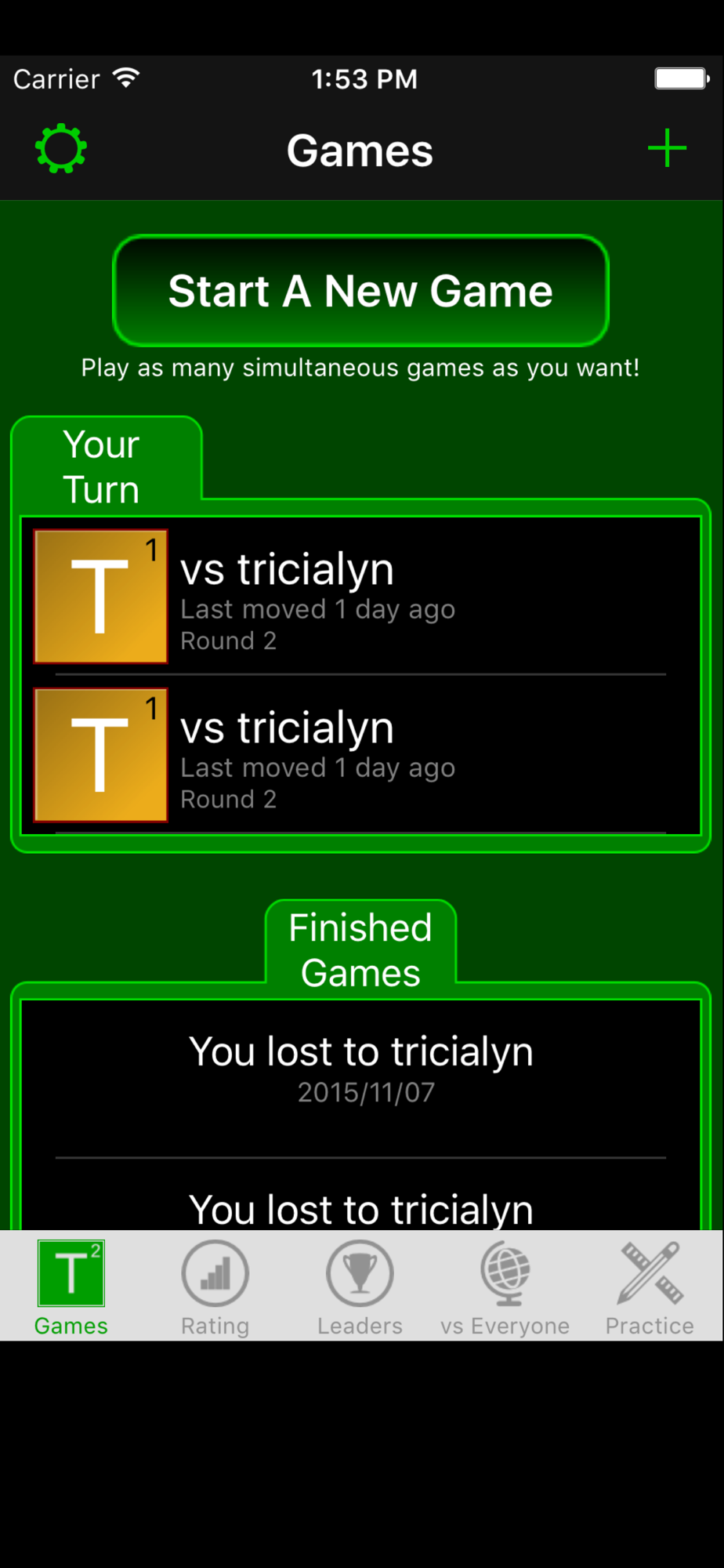 There are three types of games: Ranked Games, Friendly Games, and vs Everyone Games. Tiles By Post also has practice puzzles where you can search for words on a board with no time limit and no opponent. Challenge yourself to see if you can find half of all the words or points on a board with no time pressure.