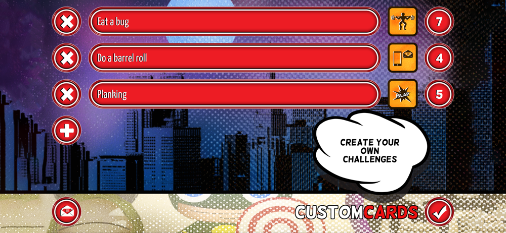 The game has around 50 challenges that include mild violence, mild optional nudity (so choose wisely who you play with), stupidity, public shame, destroying your reputation, "I wish I've never done that" and other fun activities. If you're feeling extra creative you can put up to 500 custom challenges in the game. So "kiss a dog", "do a barrel roll" and other specific challenges will have to be entered manually (don't worry it only takes 10 seconds).