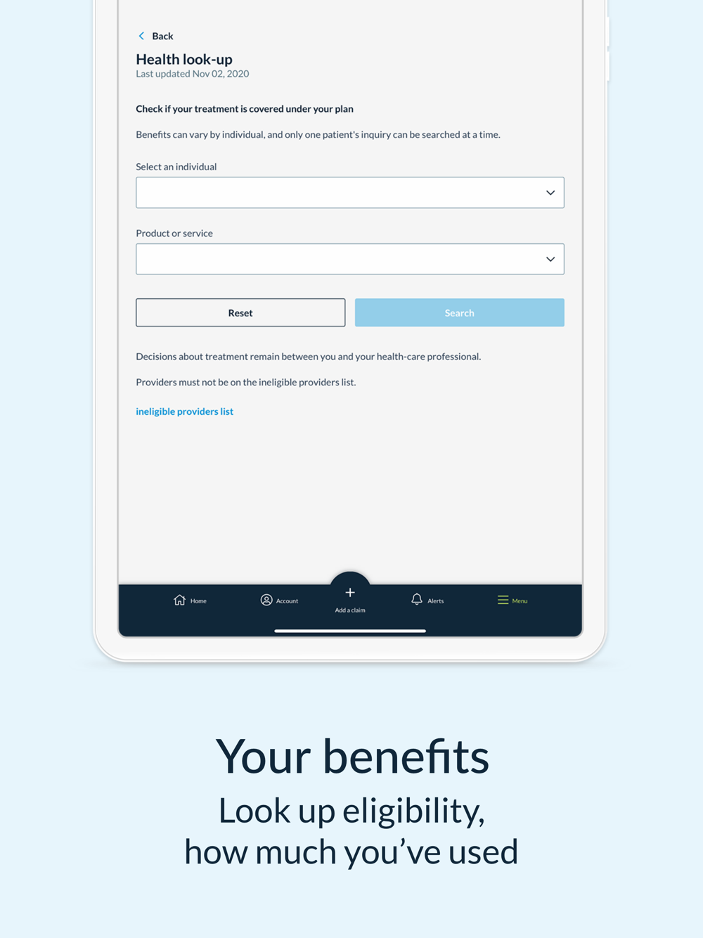 • benefit lookup—whether it is for prescription drug, health or dental, you can look up eligibility, how much of a benefit has been used and see when your next full-maximum is available,