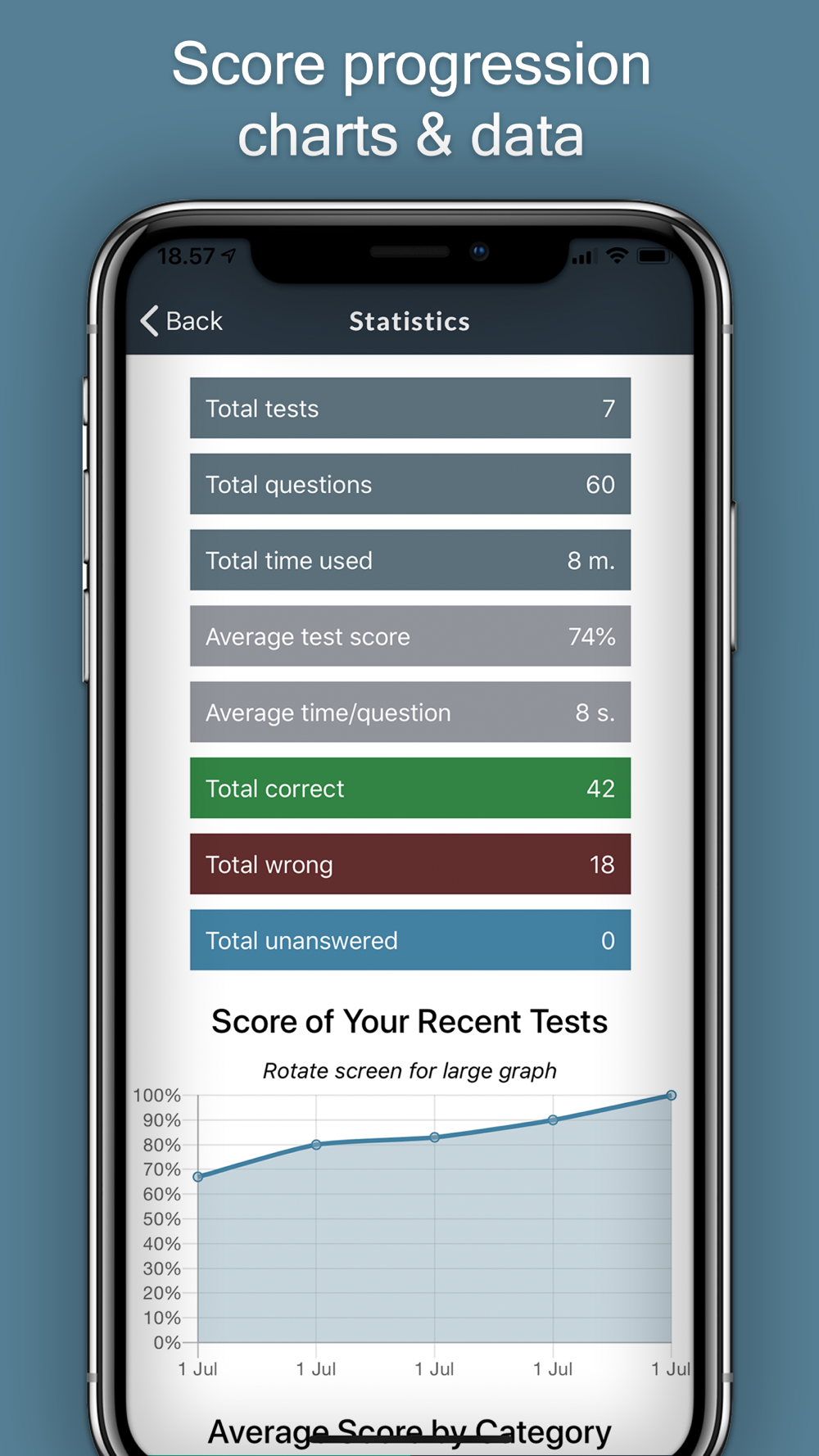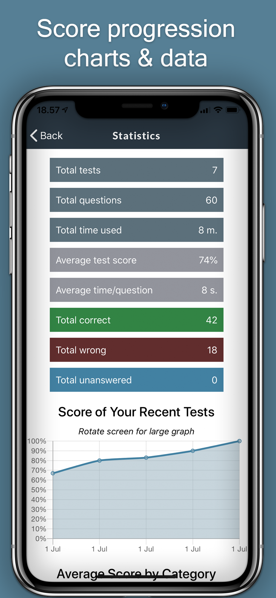 After each practice session your results with score are displayed, you can review questions and read a detailed explanation of almost every answer.