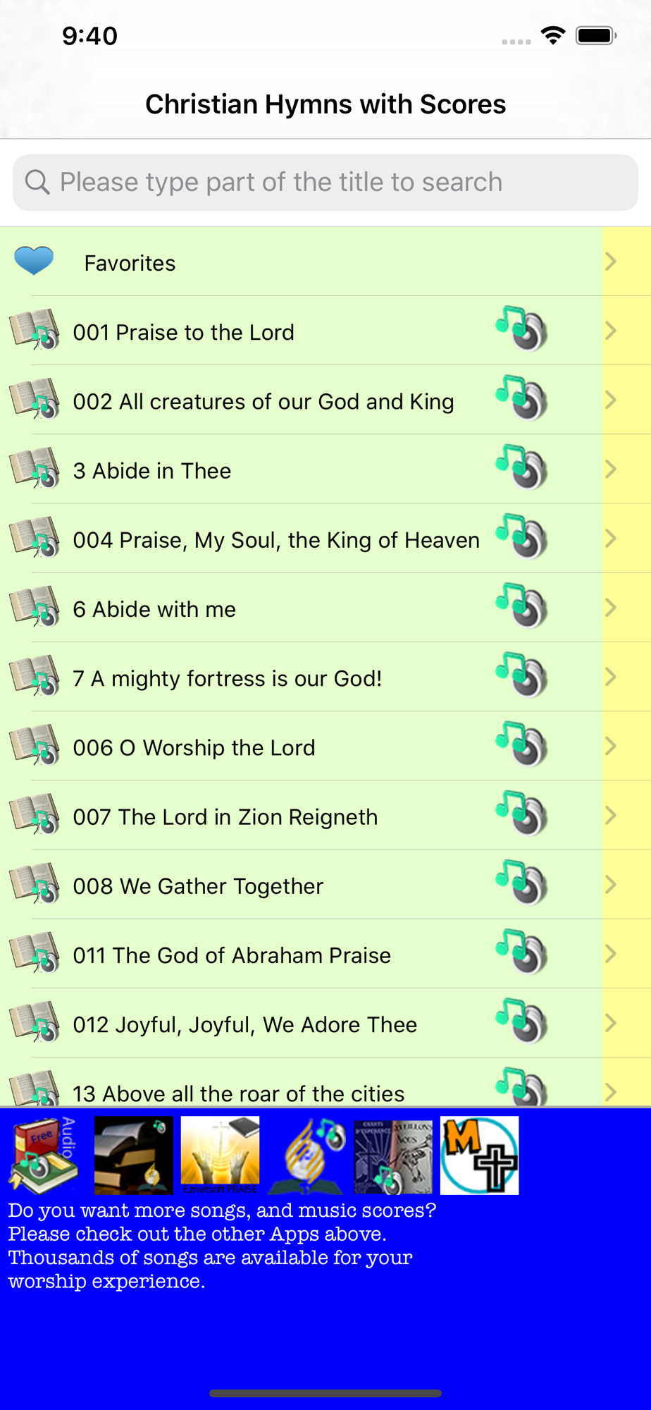 Worship Scores Lyrics & Tunes, is a sample App containing popular hymns lyrics, musics and scores for Free.
