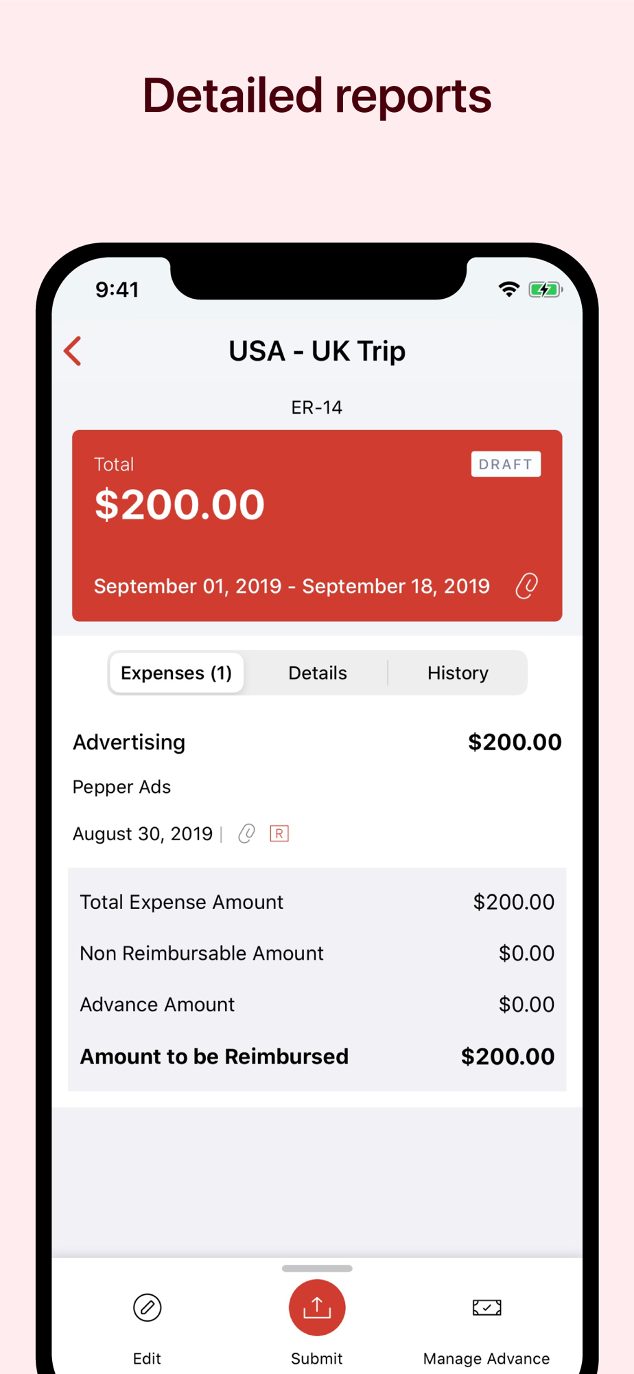 - Record and apply cash advances to your expense report. The app automatically adjusts the total expense amount.
