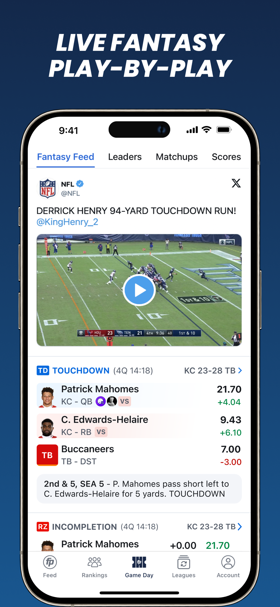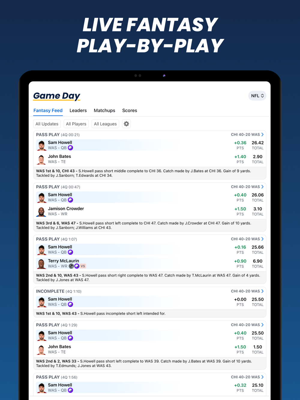Real-time fantasy football feed, stat leaders, and league matchups with live fantasy scoring for your teams.
