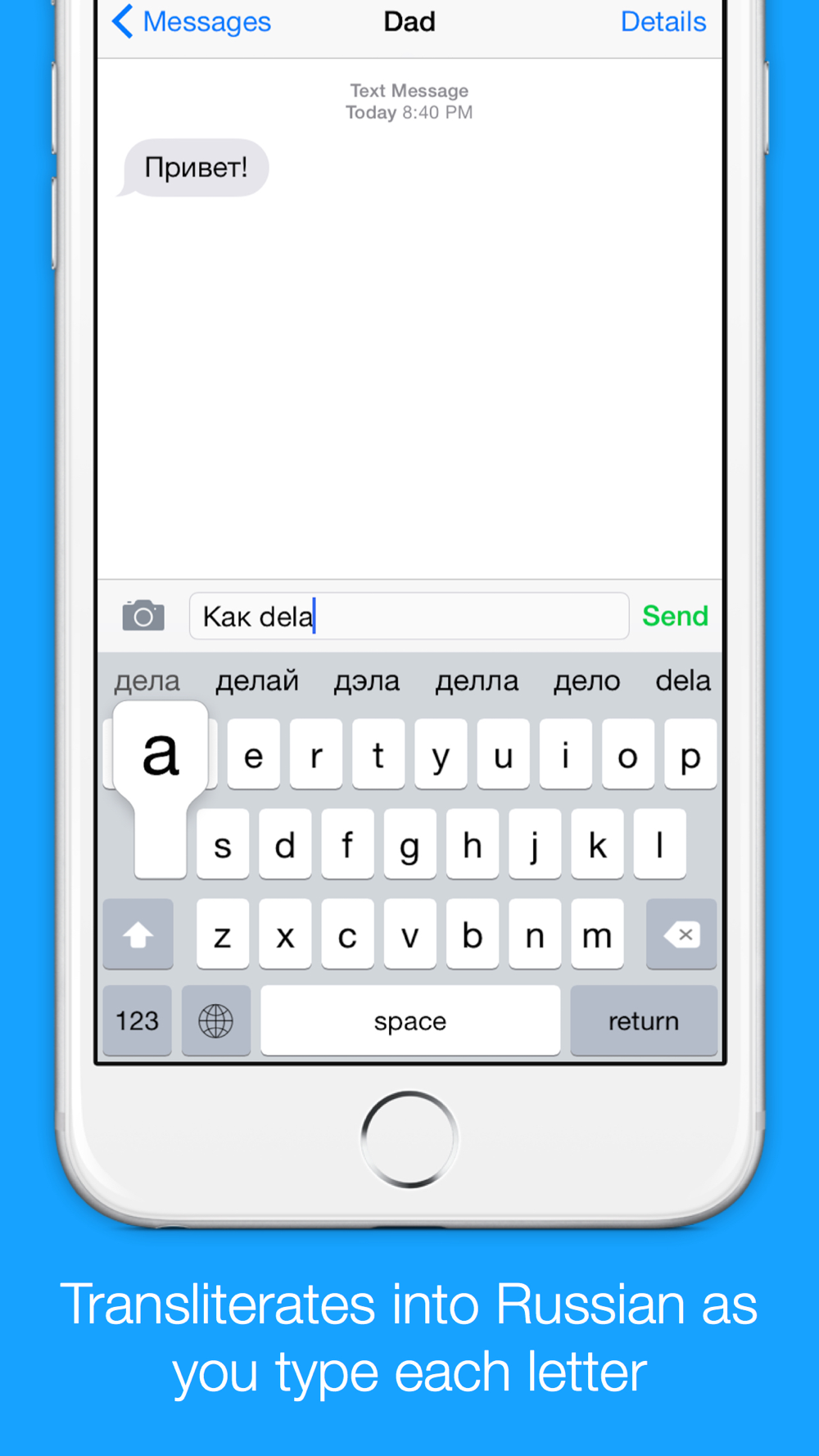 For example, typing "Privet" will give you “Привет” right as you type! It’s simple, fast and super accurate. You don’t need to worry about typing in the exact English spelling for an Russian word, KeyNounce is smart enough to accept many input spellings for the same output word.